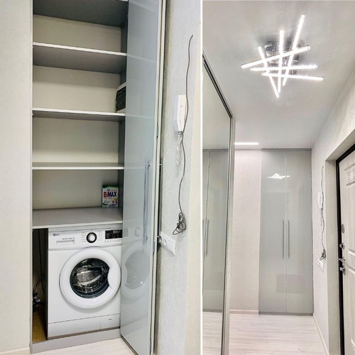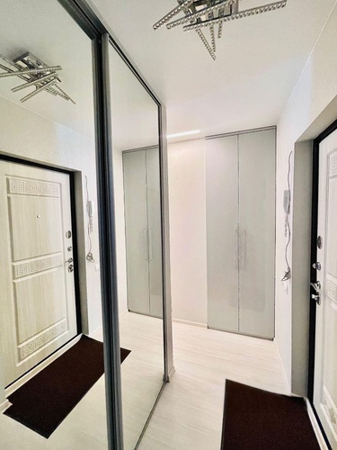 * Вместительная гардеробная. В прихожей большая вместительная гардеробная с большой зеркальной дверью.