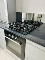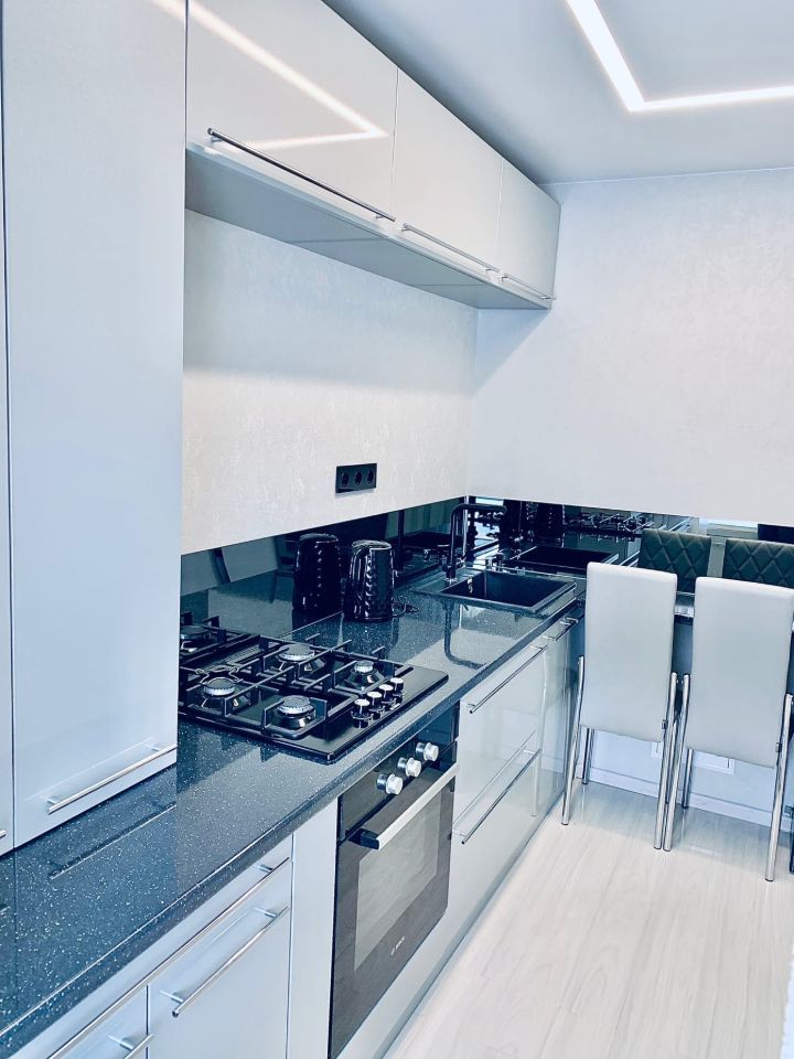* Функциональная кухня. Большой гарнитур с акриловыми фасадами и встроенная техника.