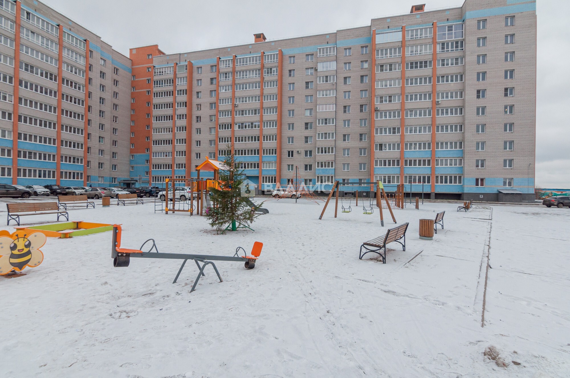 Территория дома огорожена забором - множество парковочных мест и детская площадка.