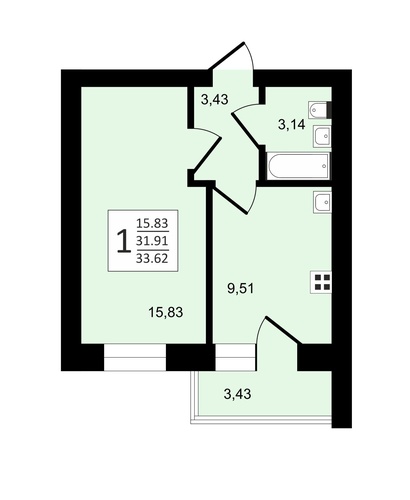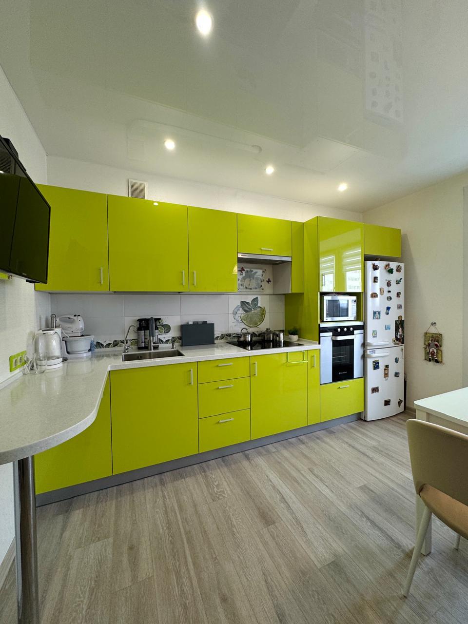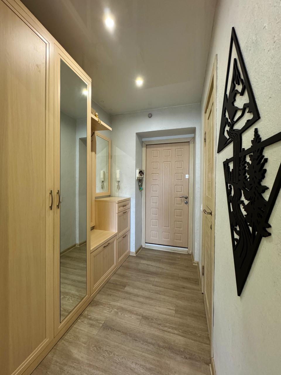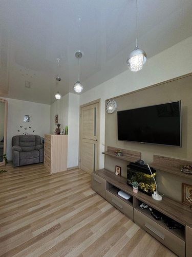 Новым собственникам остаётся: кухонный гарнитур, варочная панель, духовой шкаф, вытяжка, кухонный стол, мебель в прихожей, зона ТВ, диван в комнате, угловой шкаф.