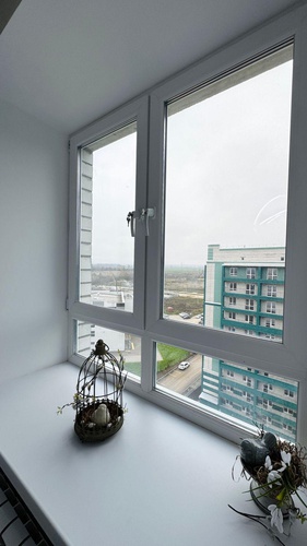 Квартира очень светлая благодаря панорамным окнам на кухне и увеличенным проёмам в спальне.