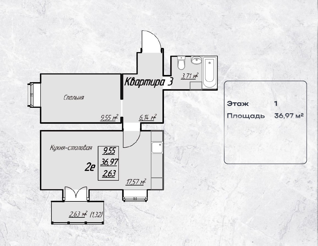 - Общая площадь: 36,97 м² — простор для воплощения ваших дизайнерских идей.