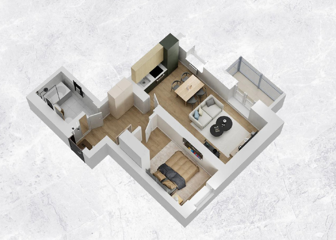 - Жилая зона 9,55 м²: личное пространство для отдыха и работы.