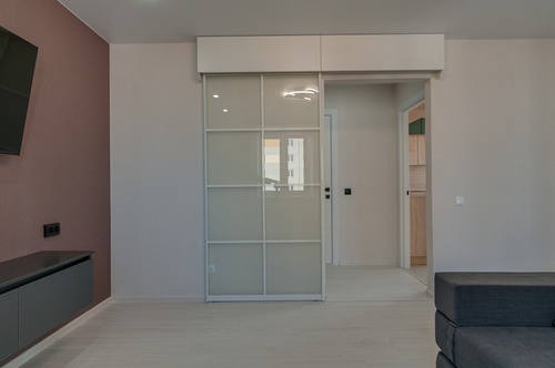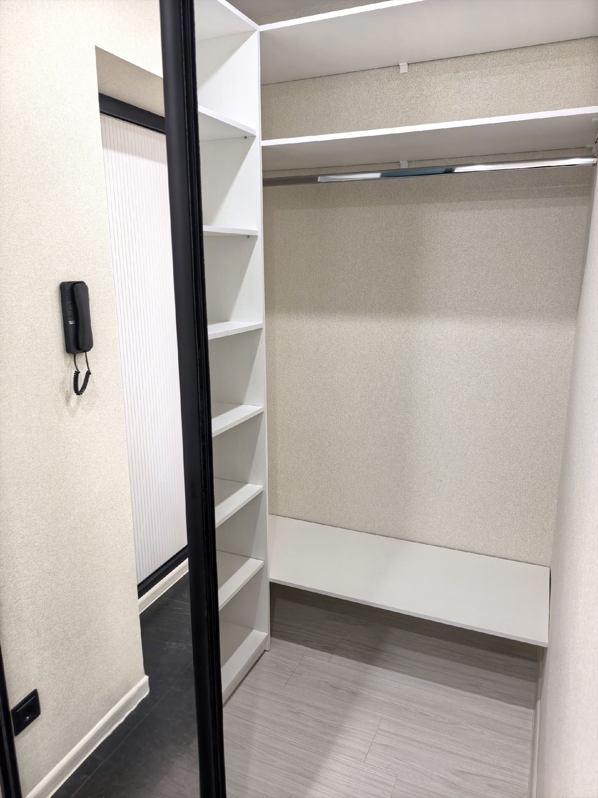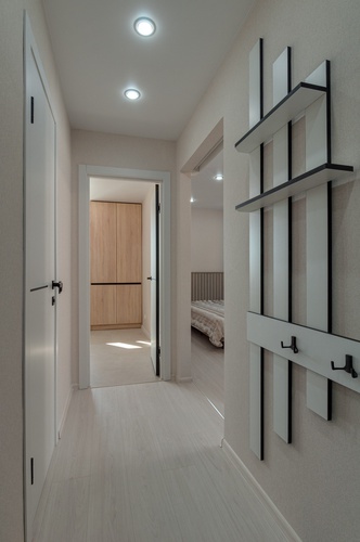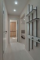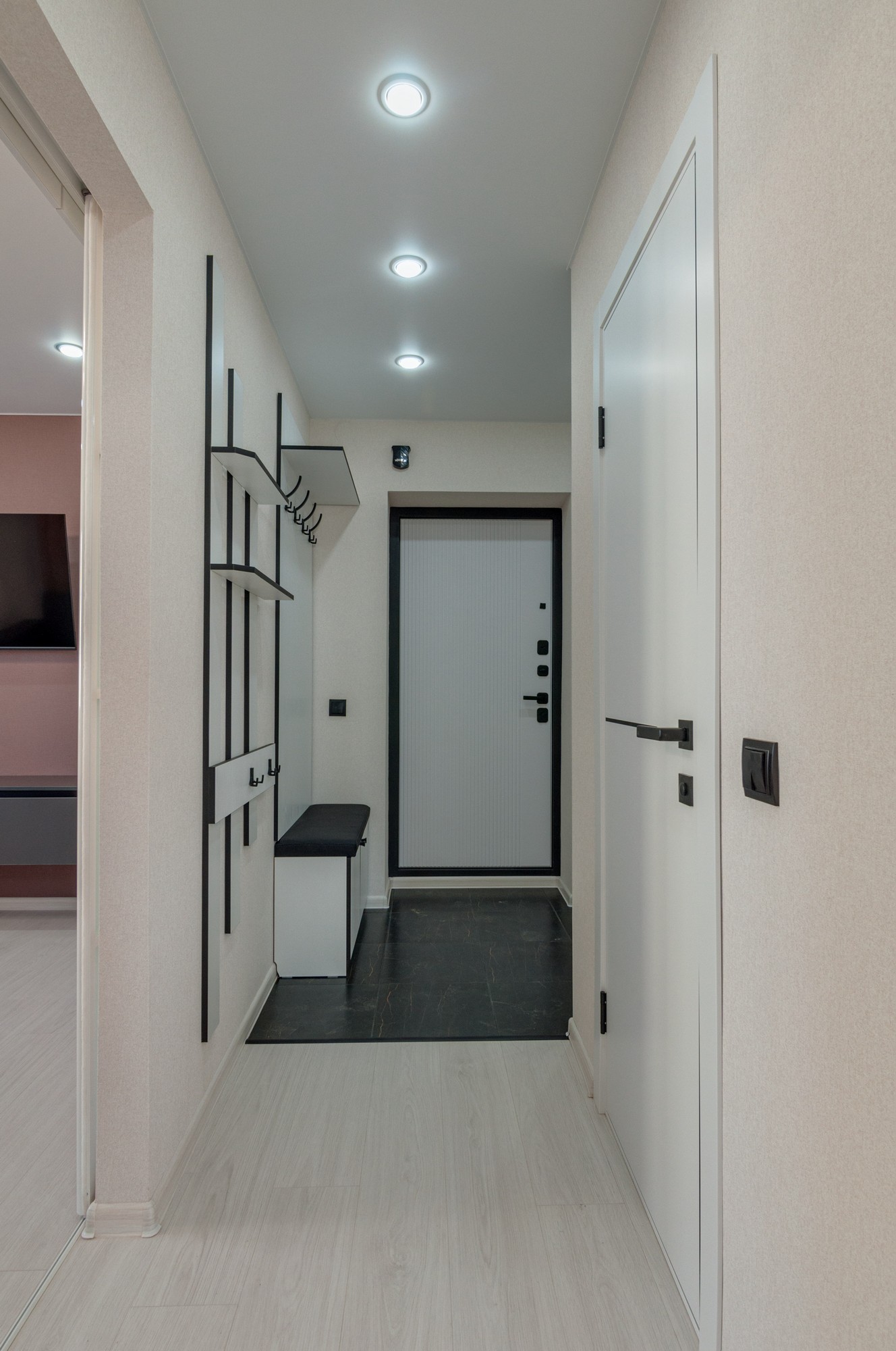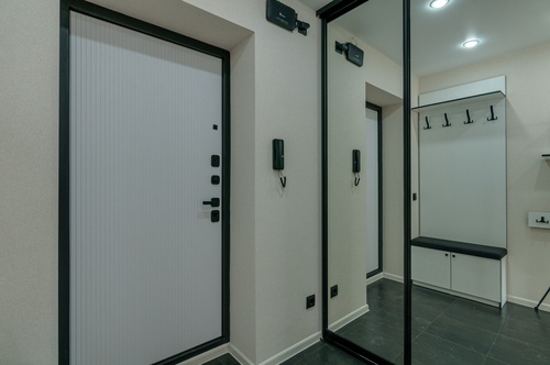 Новая прочная входная дверь. В коридоре выделена зона гардеробной с большими раздвижными зеркальными дверями и наполнением (куда войдет все).