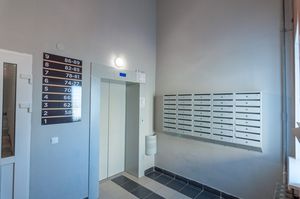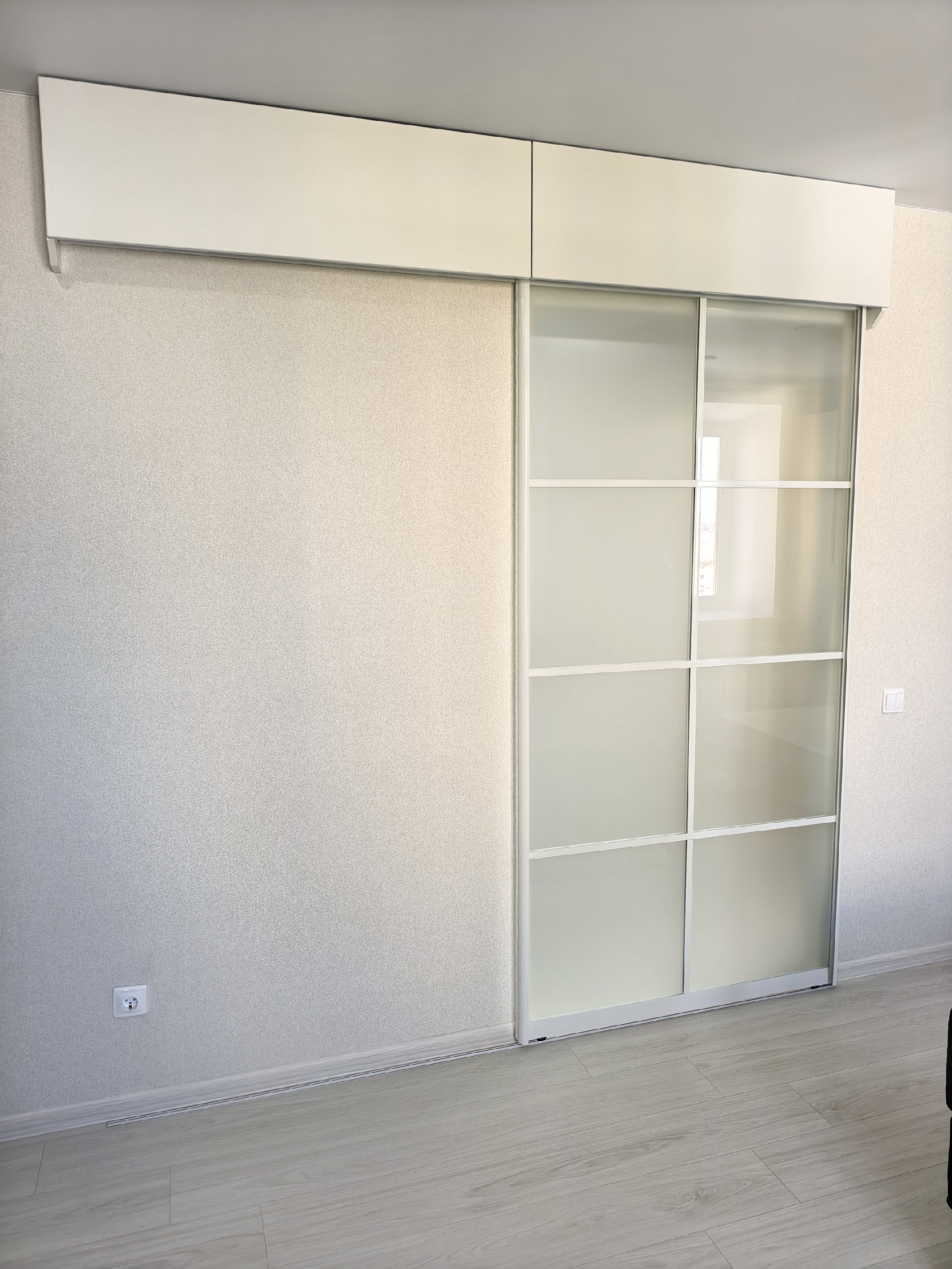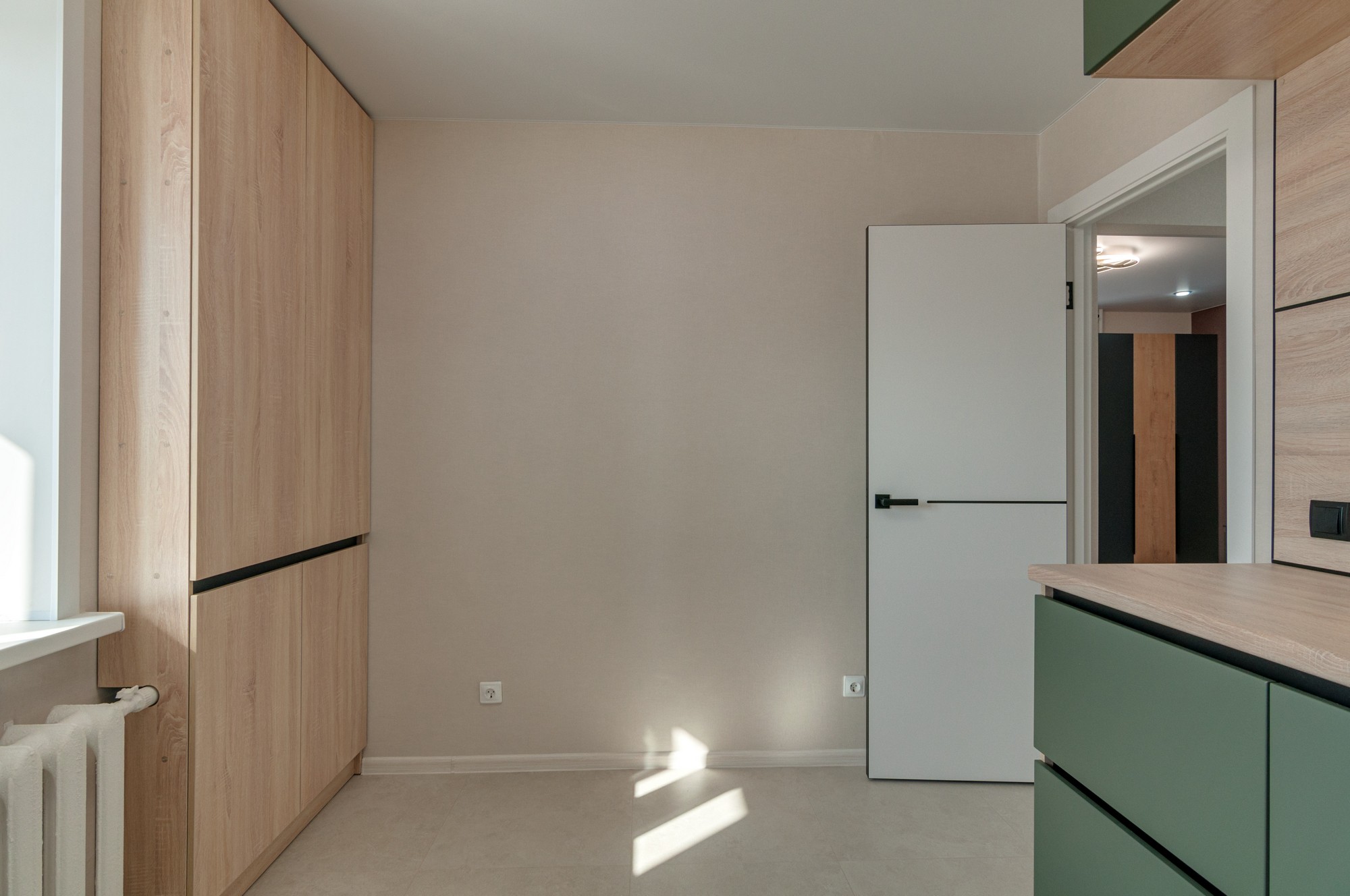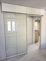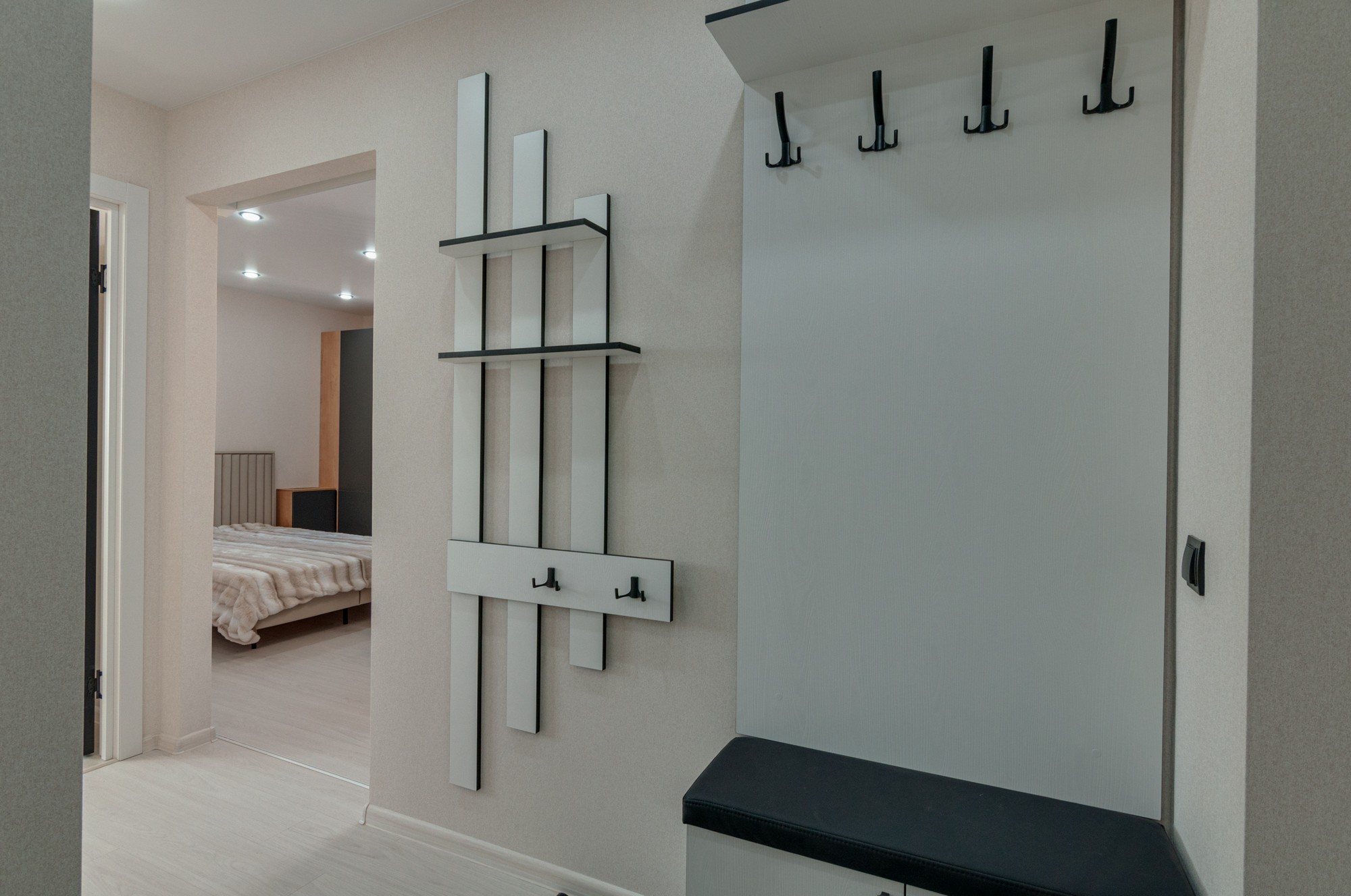 Новая прочная входная дверь. В коридоре выделена зона гардеробной с большими раздвижными зеркальными дверями и наполнением (куда войдет все).