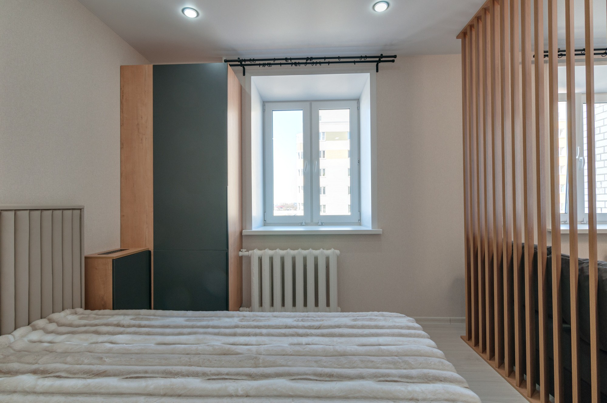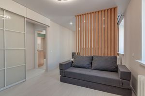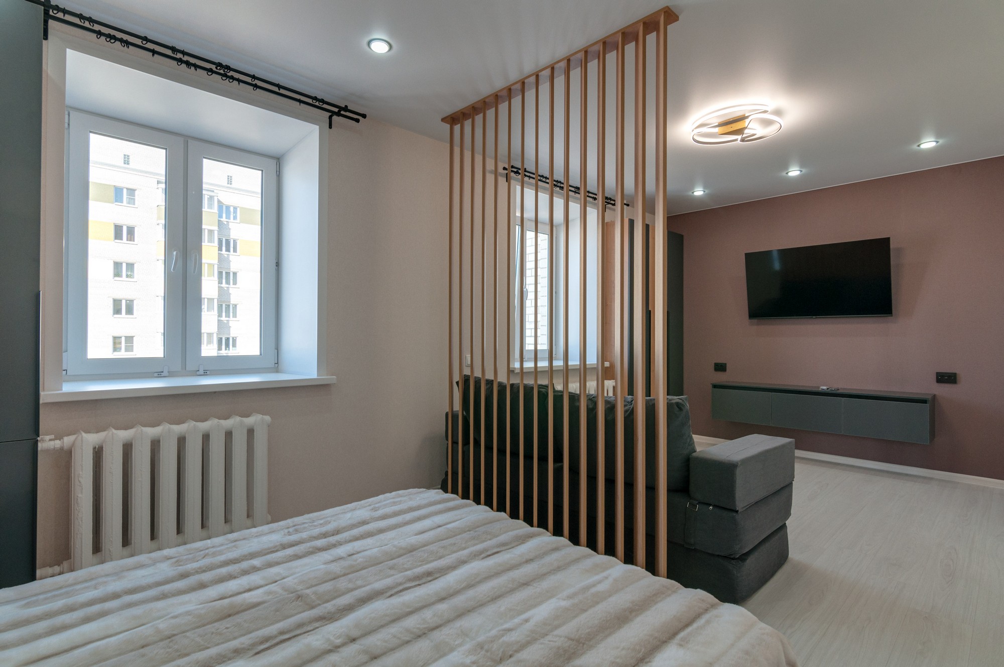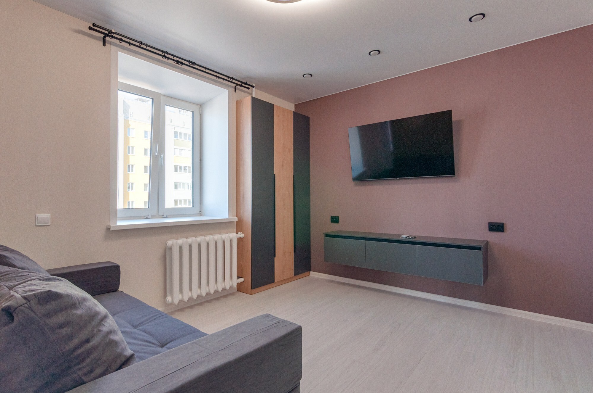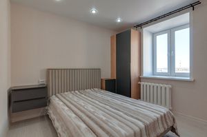 Комната 18,7 кв.м с раздвижной дверью зонирована на зону спальни и гостиной (пол - ламинат 34 класса, качественные обои). Два распашных шкафа и подвесные тумбы для вещей. Установлены большая кровать, диван, телевизор Haier (диагональ 50).