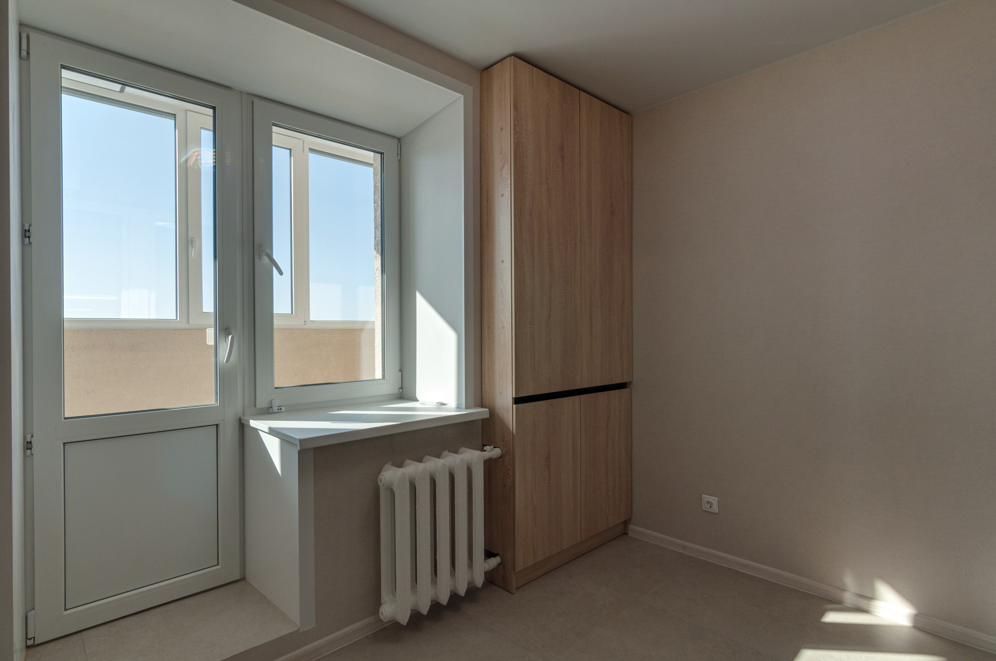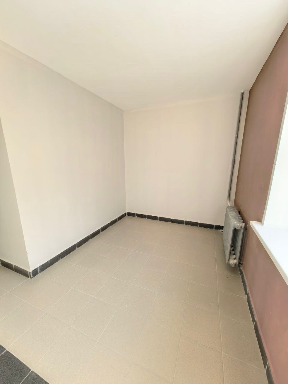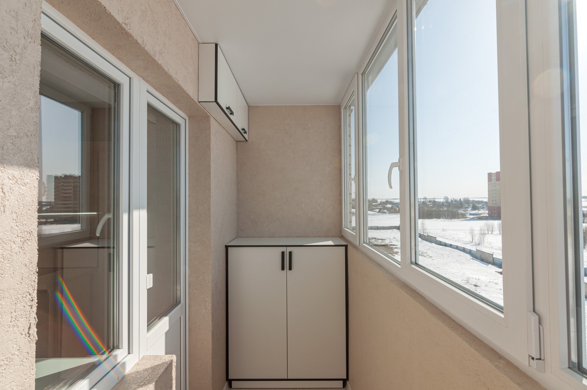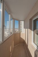 Балкон застеклен, пол - керамогранит, установлен шкаф + ящик на стене, пластиковые окна.