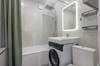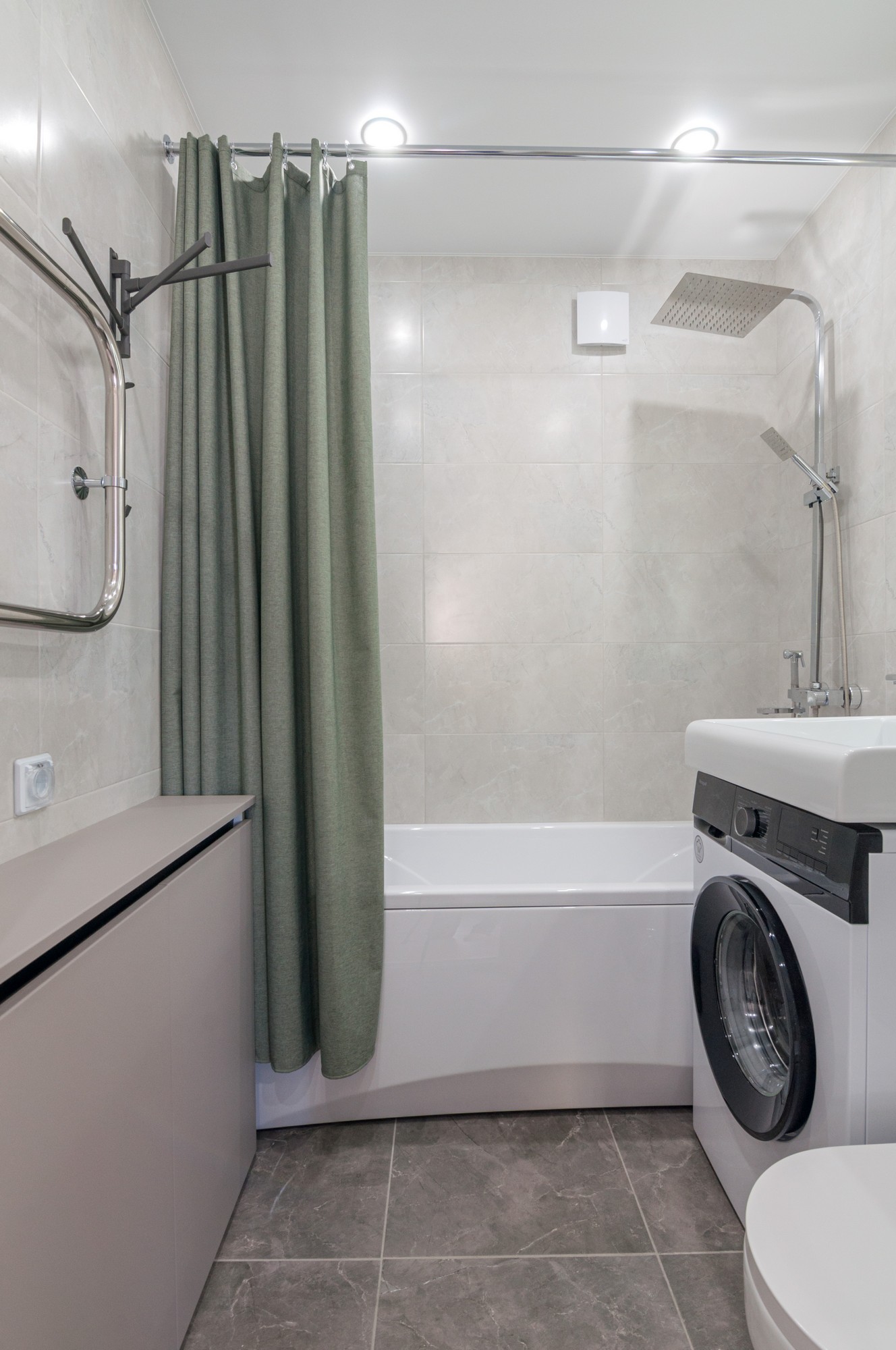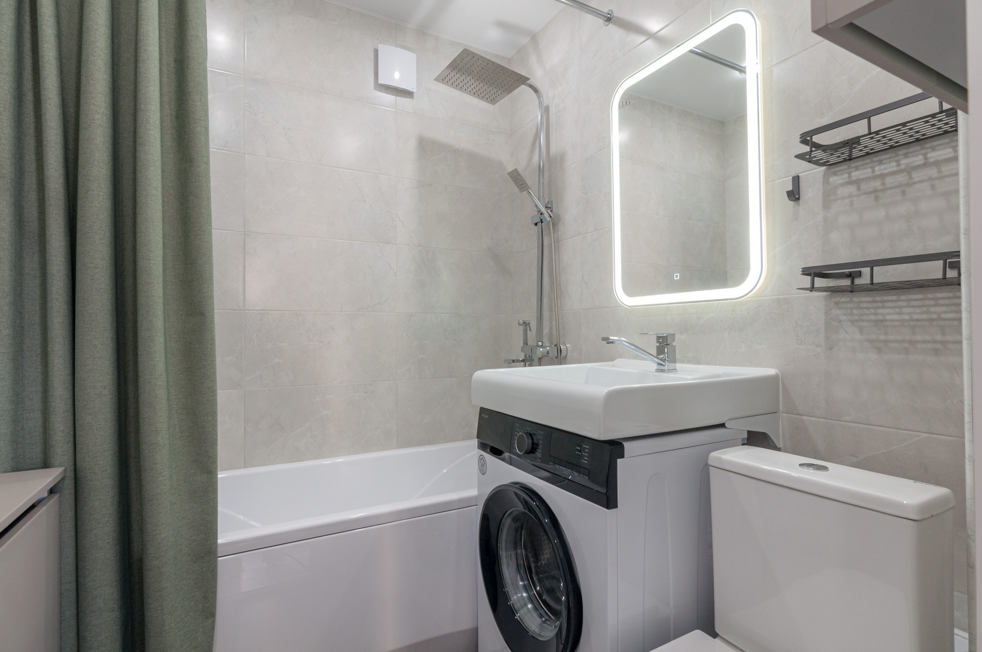Совмещенный просторный санузел в керамограните. Установлена новая стиральная машина, тропический душ, два шкафа для хозпринадлежностей. Счетчики на холодную и горячую воду.