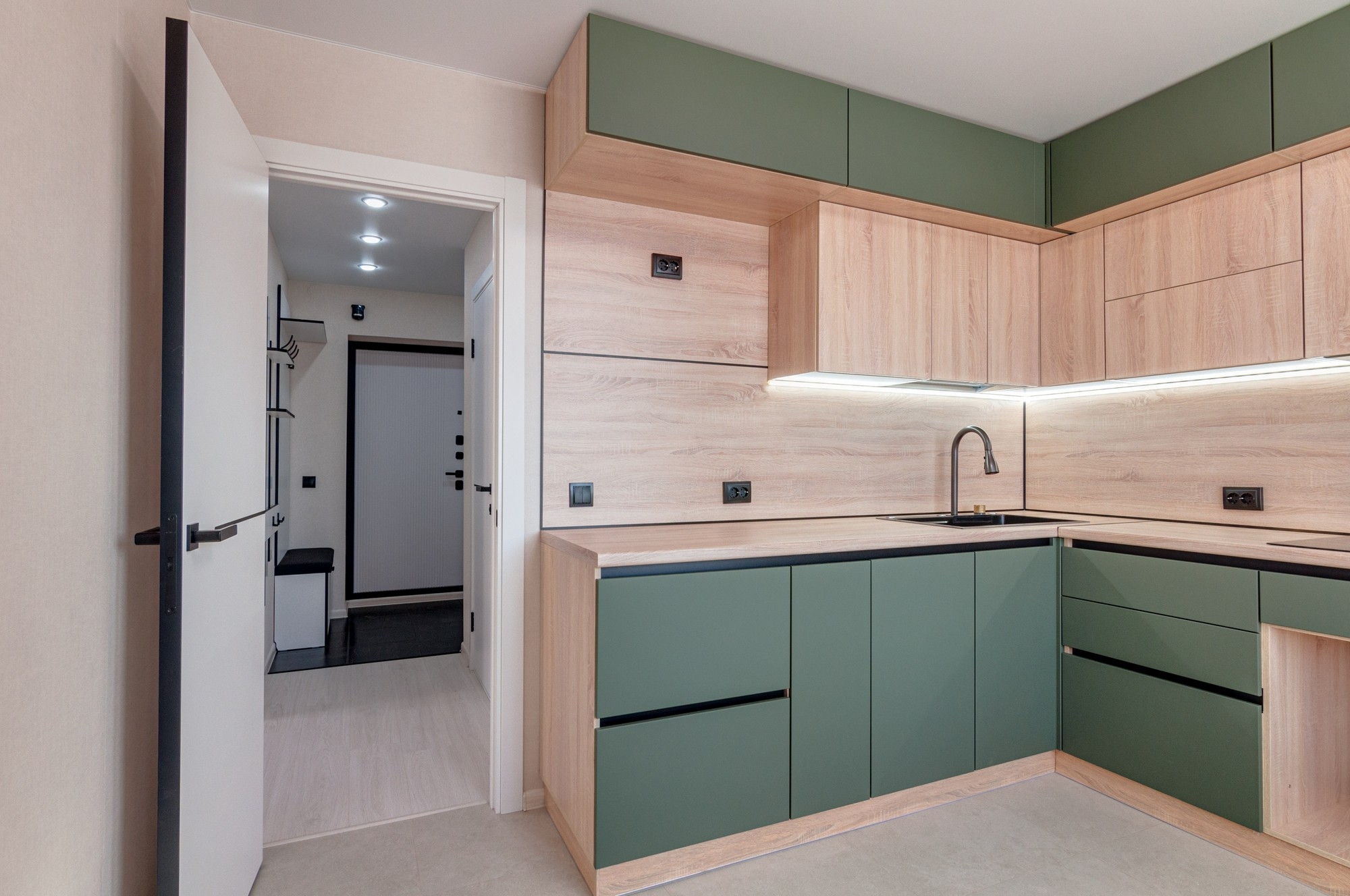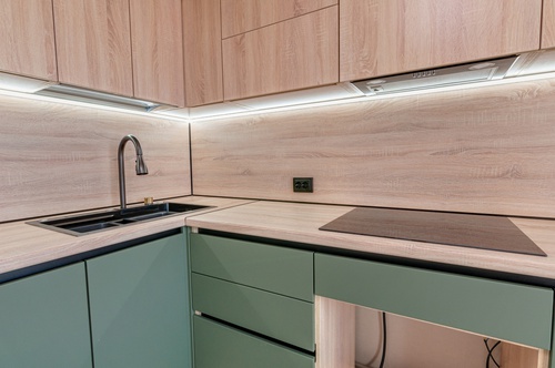- установлены современный кухонный гарнитур с мойкой, индукционной варочной поверхностью и вытяжкой, шкаф для приятных мелочей.