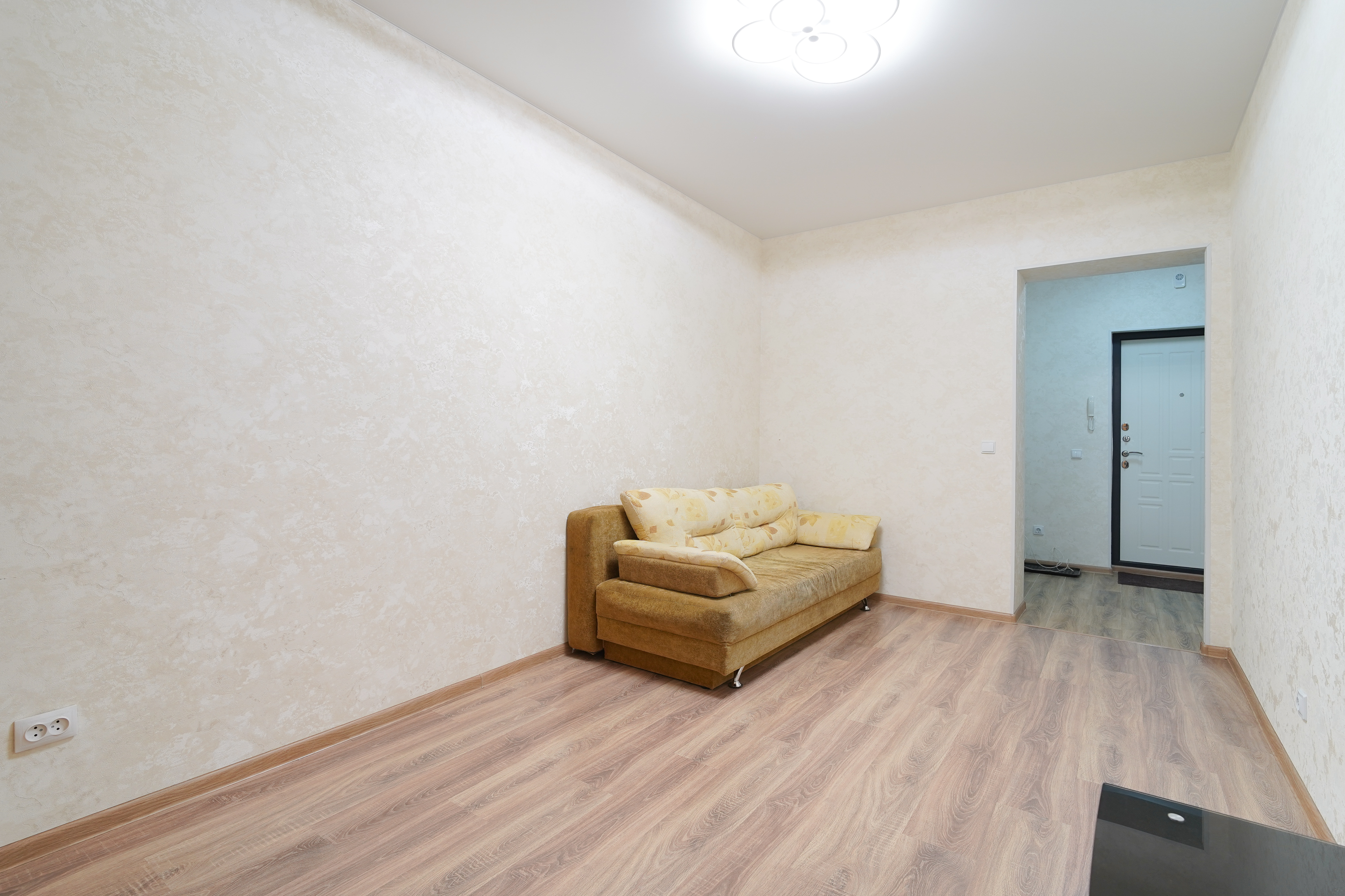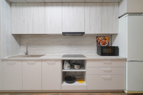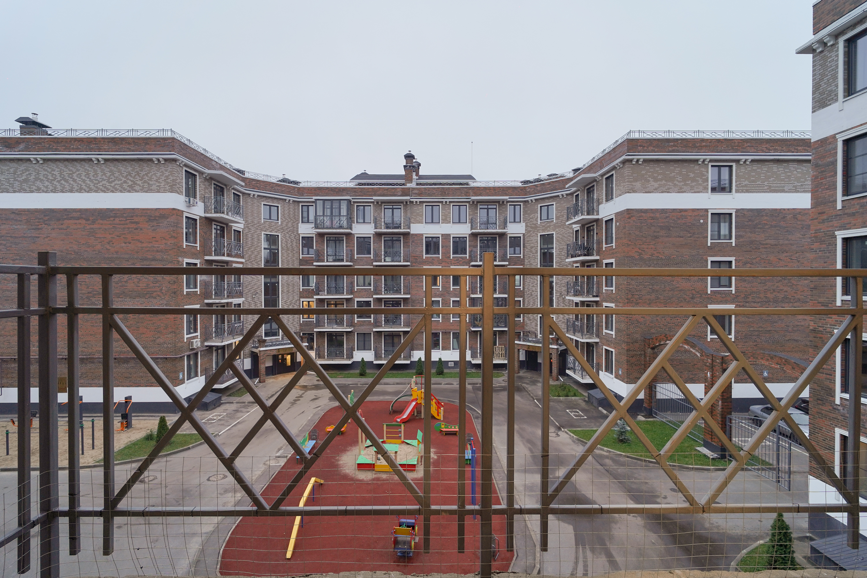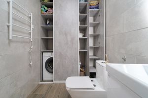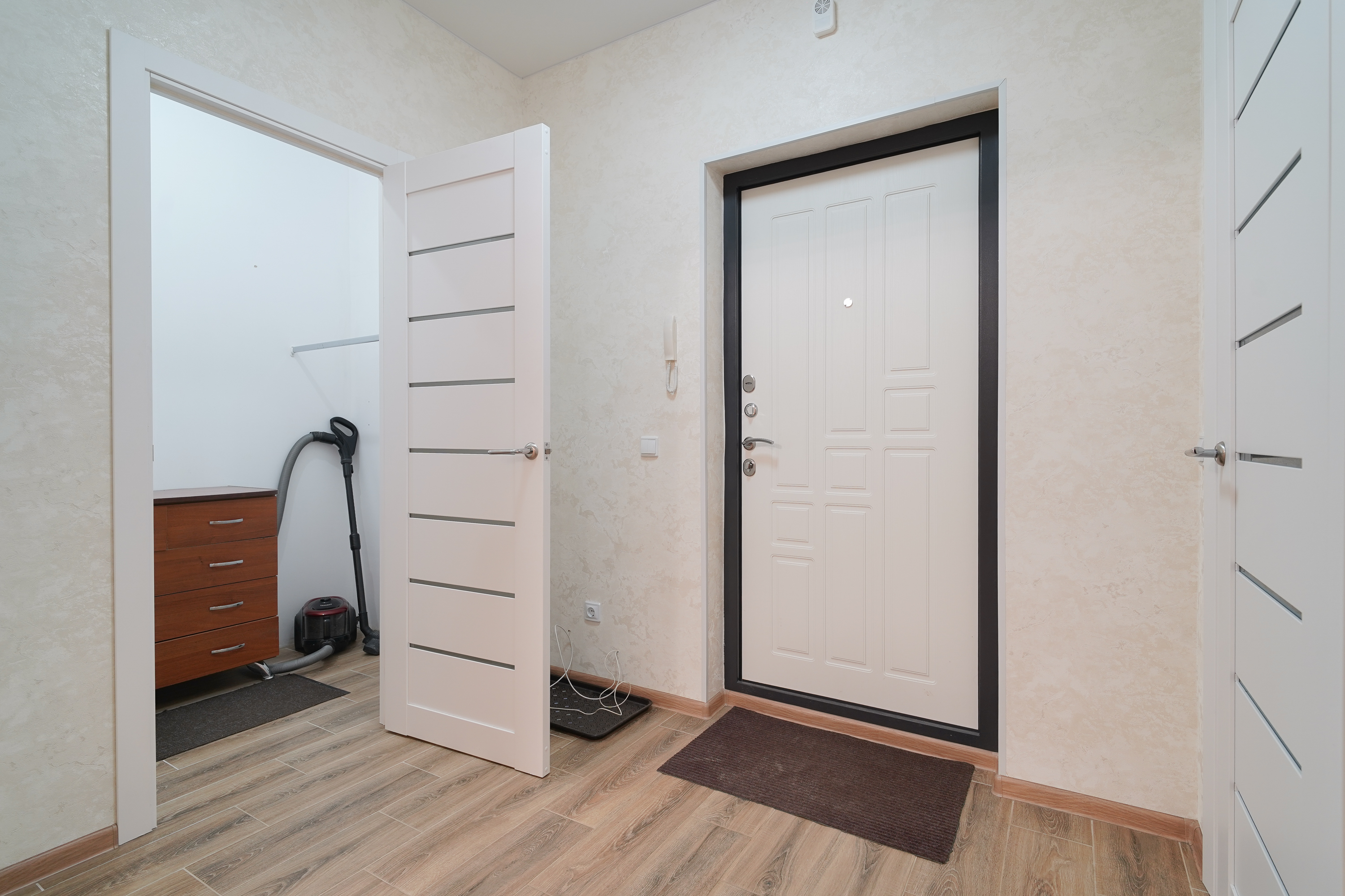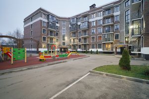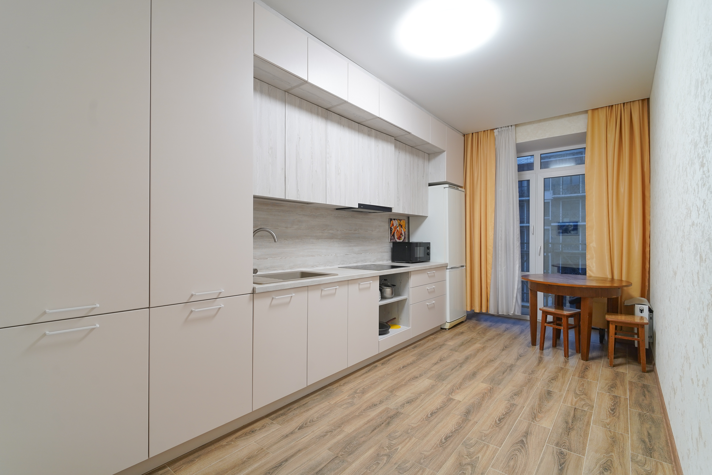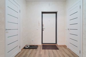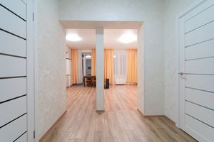 В прихожей просторная гардеробная, окна выходят во двор, на кухне панорамное остекление с выходом на балкон.