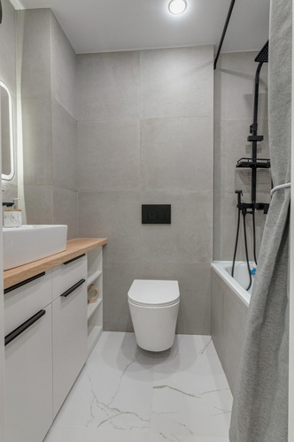 — качественные отделочные материалы: ламинат Tarkett, керамогранит в ванной и прихожей, тёплый пол для уюта.