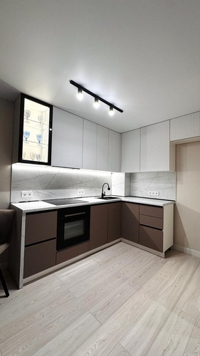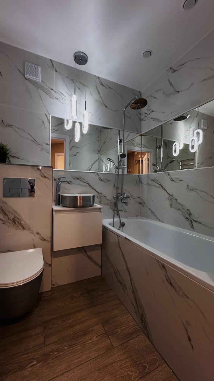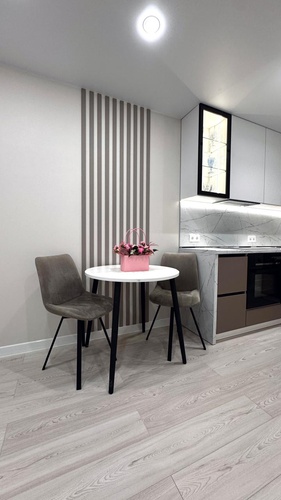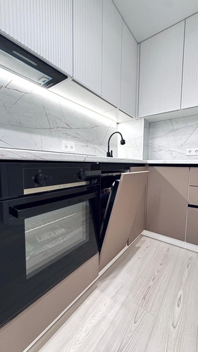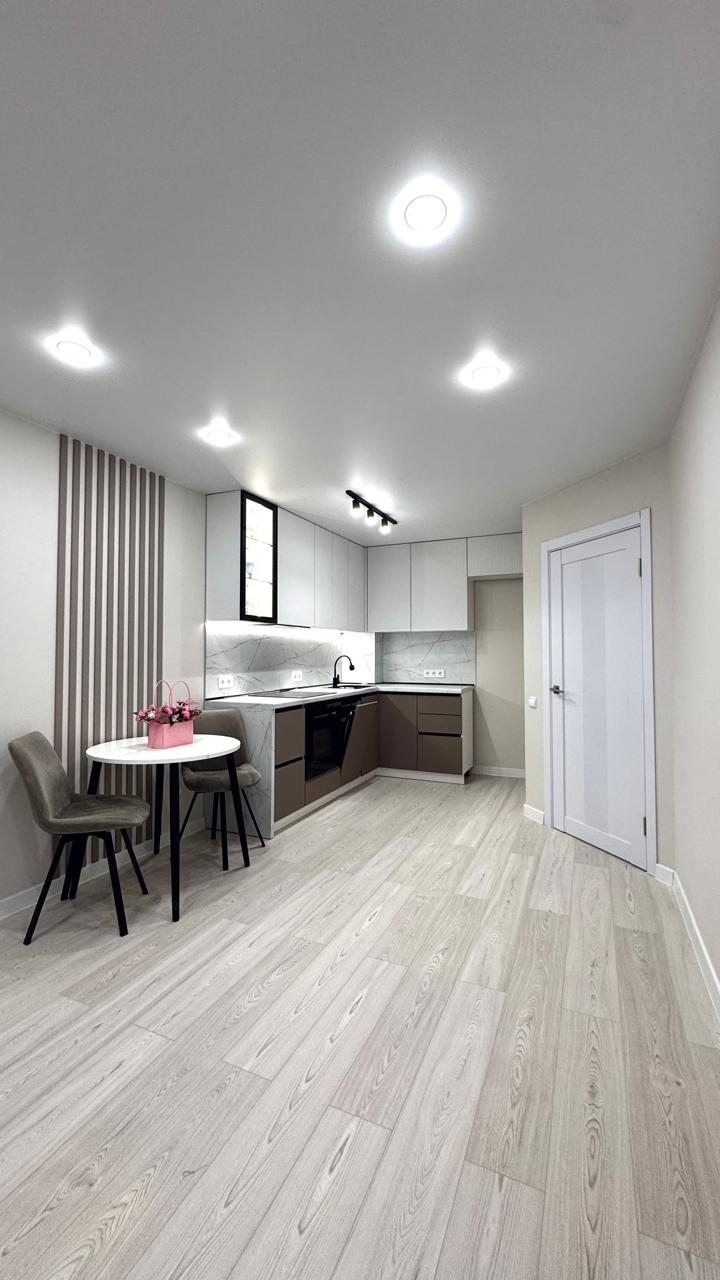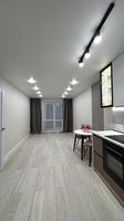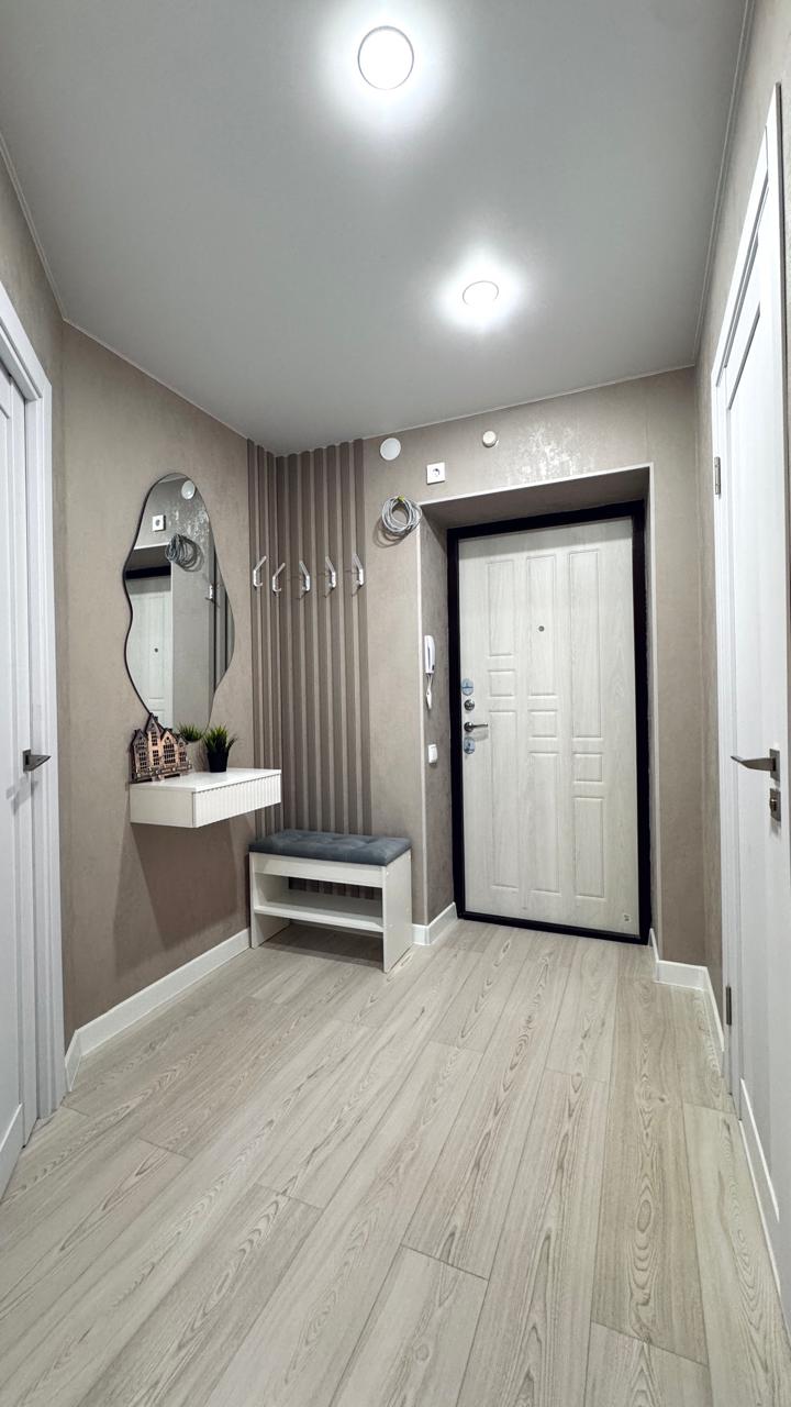 В квартире сделан качественный ремонт, установлен современный кухонный гарнитур, посудомоечная машинка, варочная панель, духовой шкаф, вытяжка, обеденная зона, мебель в прихожей, раковина в ванной комнате.
