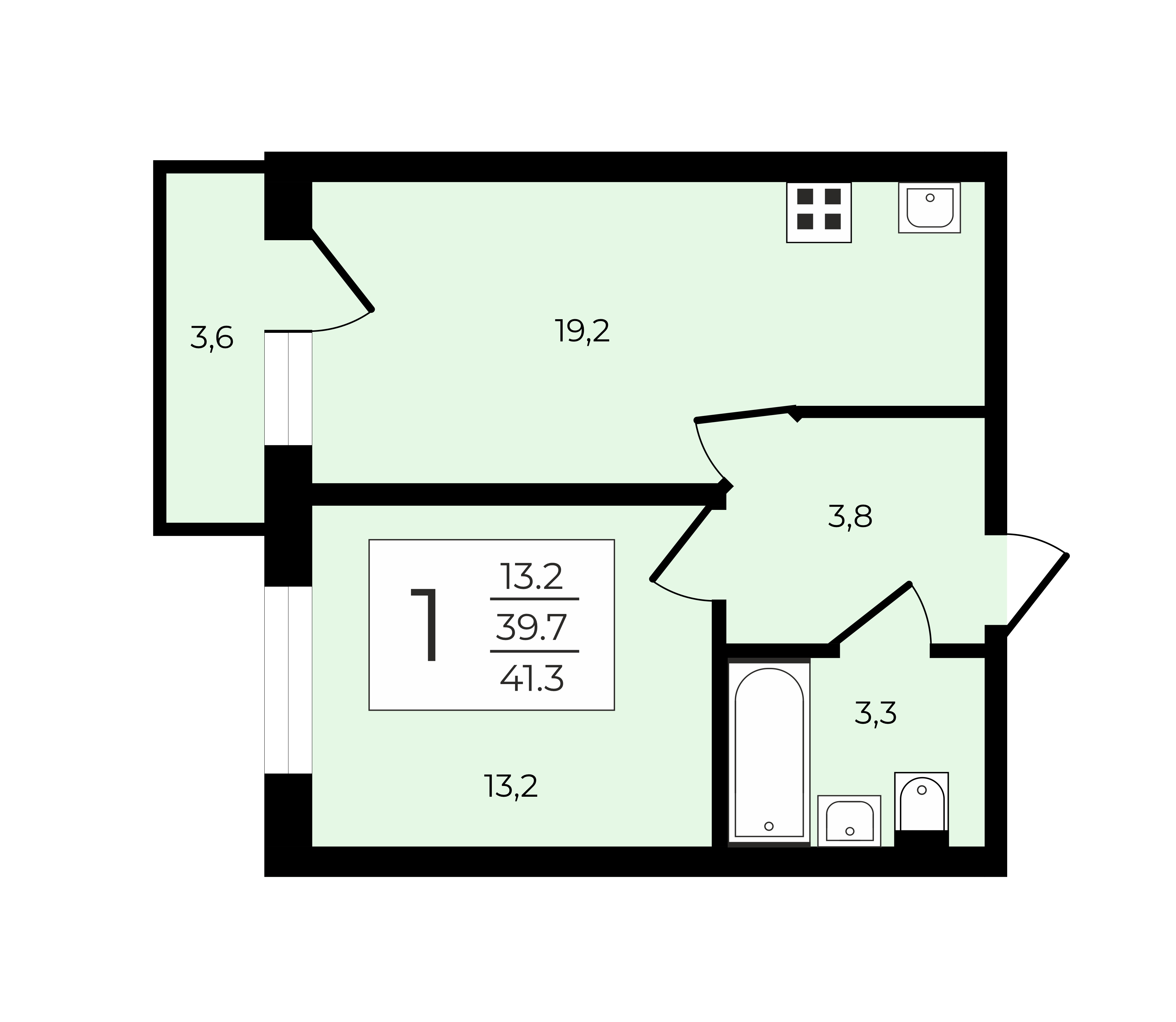 Квартира очень светлая благодаря панорамным окнам на кухне и увеличенным проёмам в спальне.
