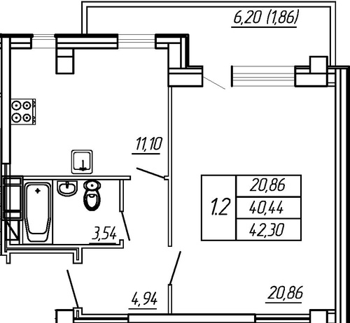 Квартира общей площадью 42,3 кв.м.