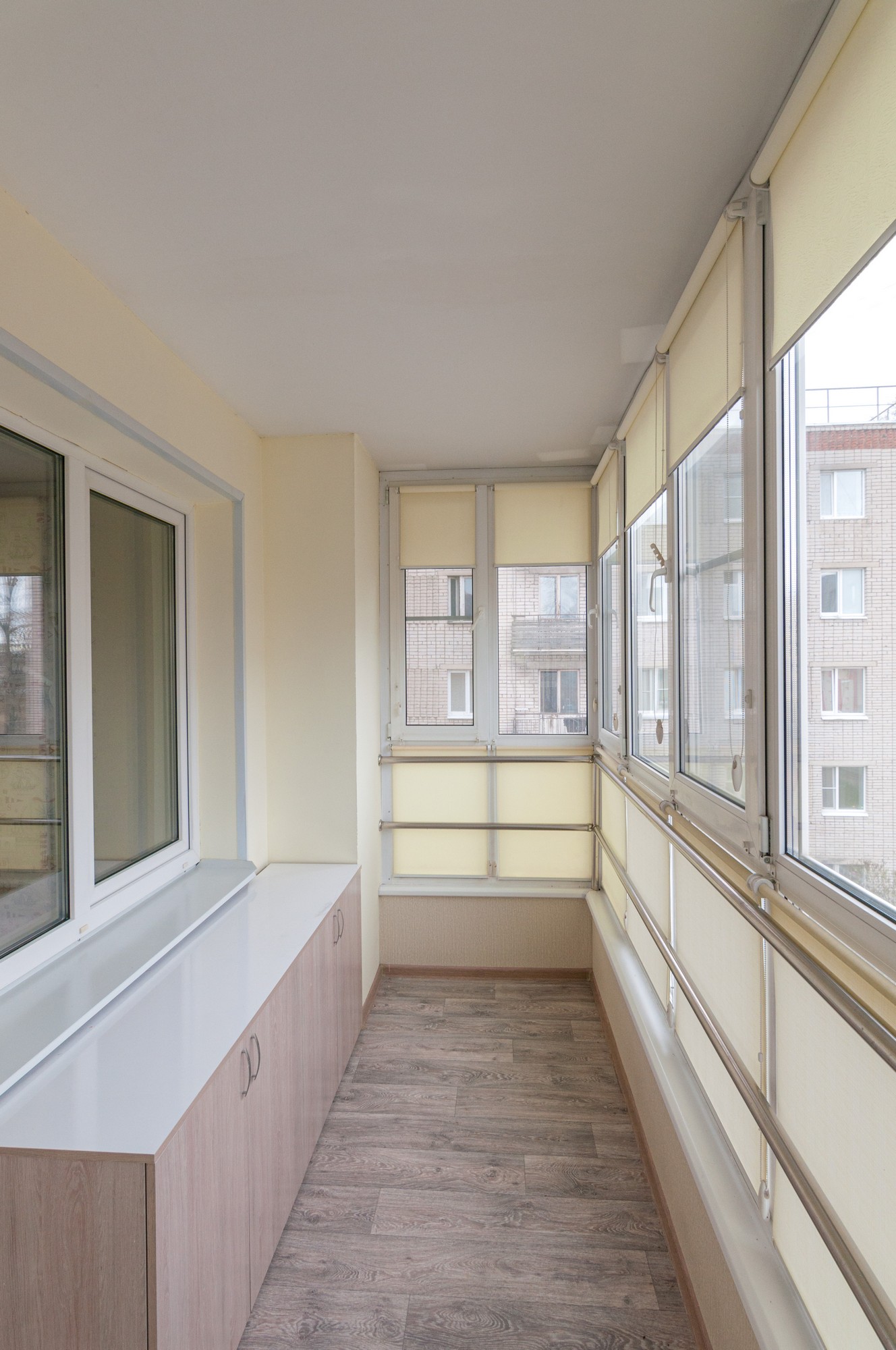 Кухня с двумя окнами, очень светлая и просторная. С не маленьким кухонным гарнитуром, в котором встроен газовый котел Baxi.