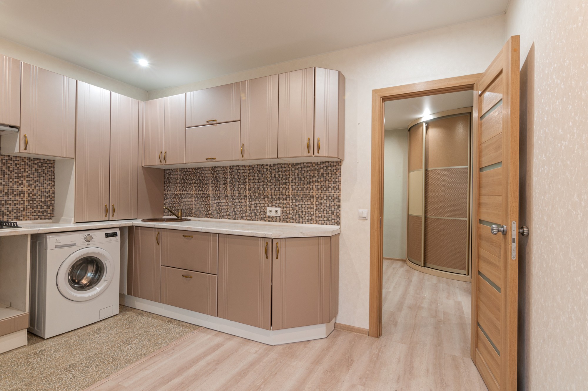Остается большой, очень вместительный встроенный шкаф в комнате, современный и вместительный кухонный гарнитур, а так же стиральная машинка - Электролюкс итальянской сборки.