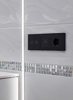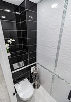 Санузел в кафельной плитке с инсталляцией и гигиеническим душем.