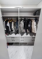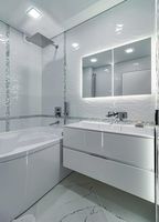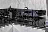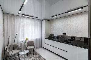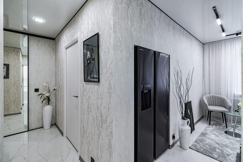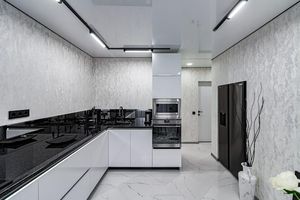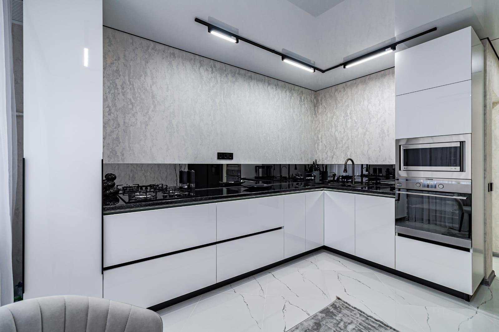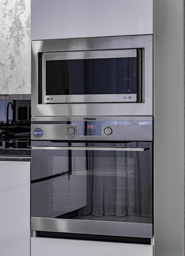- Стильный гарнитур с акриловыми фасадами и встроенной техникой: посудомоечная машина, стиральная машина с сушкой, духовой шкаф, варочная панель, микроволновая печь, встроенная корзина для посуды, холодильник Side-by-Side с ледогенератором.