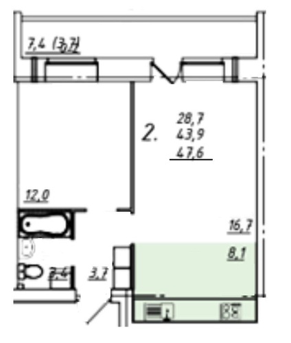 Площадь квартиры составляет 47.6 кв. м, из которых 12.1 кв. м занимает уютная жилая комната, а просторная кухня площадью 25.2 кв. м идеально подойдет как для приготовления пищи, так и для семейных встреч. Окна выходят на улицу, что создаст приятный световой фон в течение всего дня.