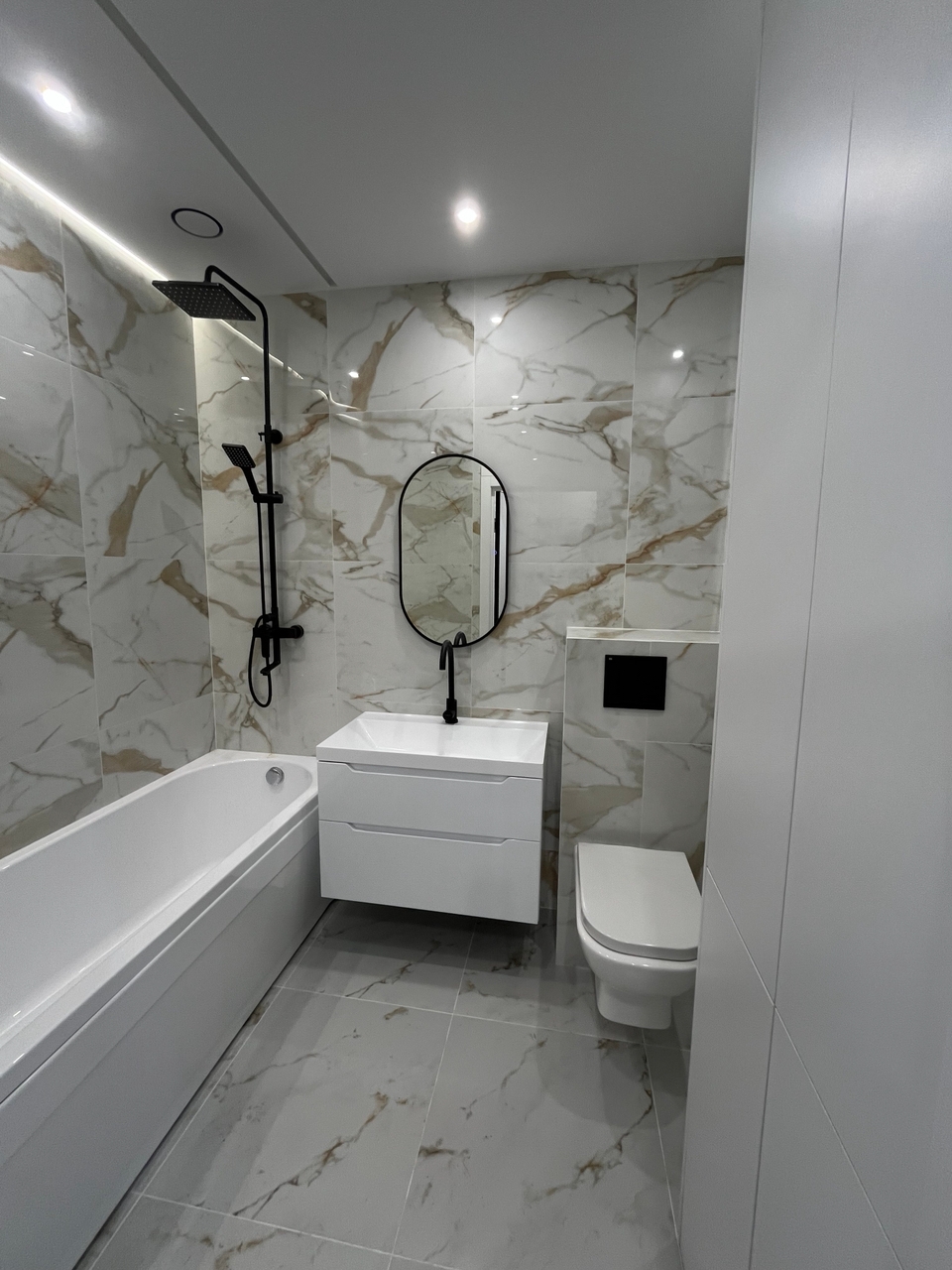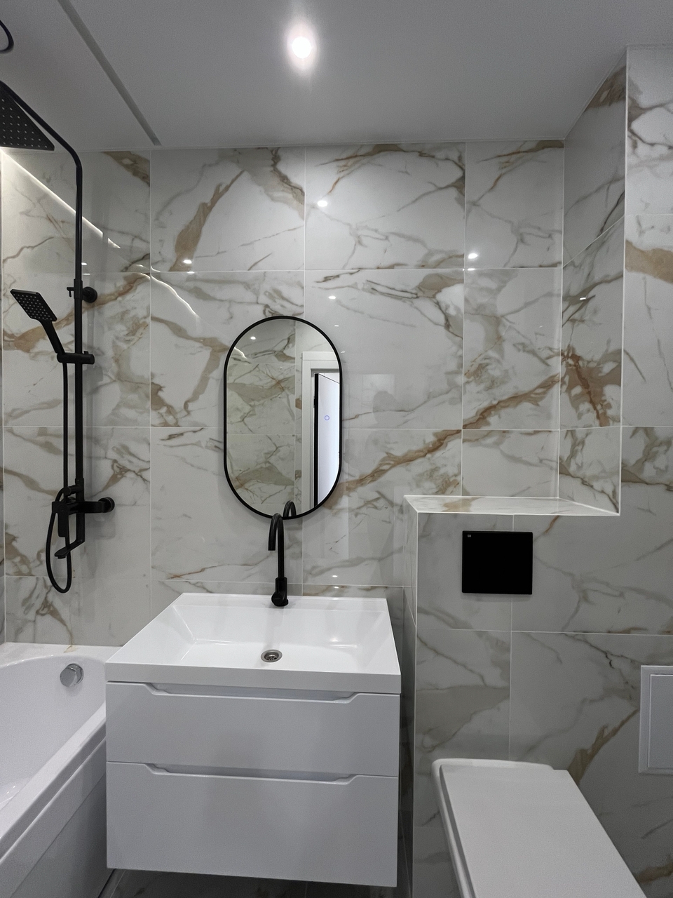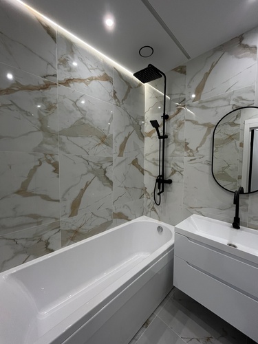 В сан узле плитка и первоклассная сантехника.