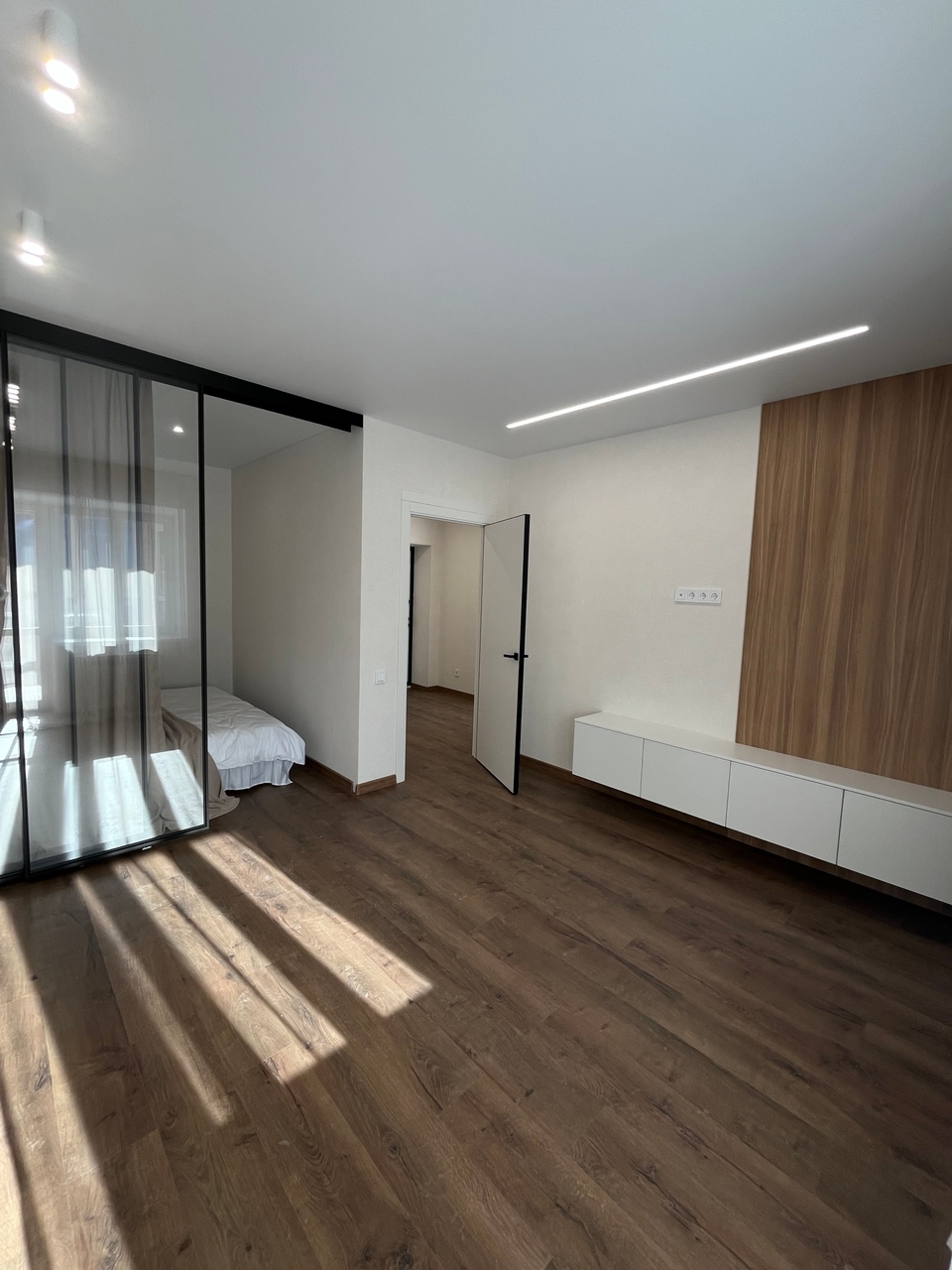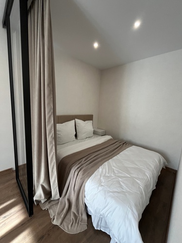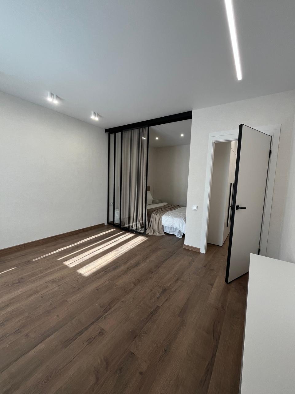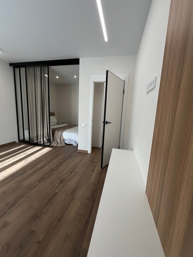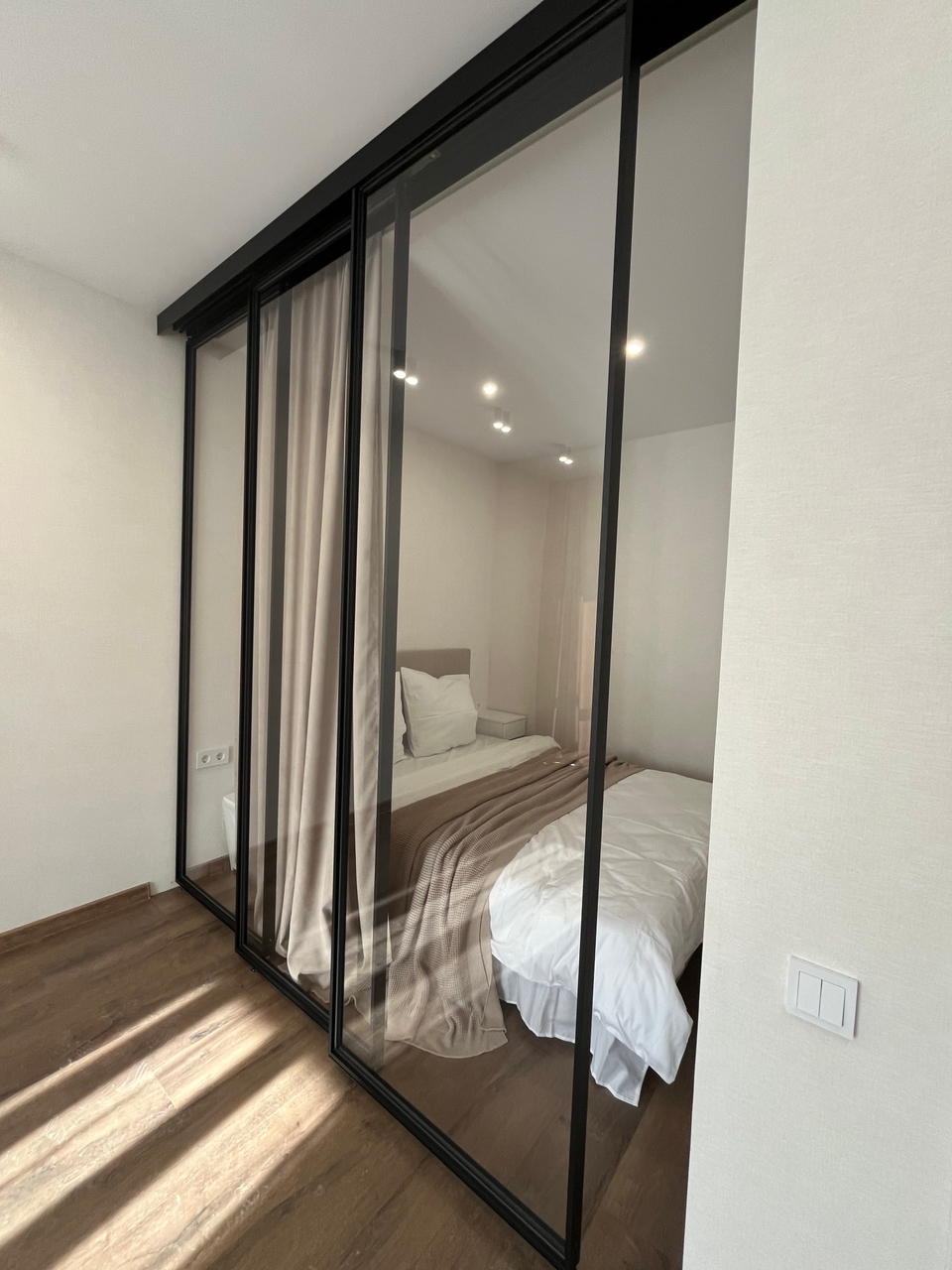 В спальне сделано грамотное зонирование с помощью стеклянной, очень модной и современной перегородки. Зона спальни закрыта от посторонних глаз благодаря шторам.