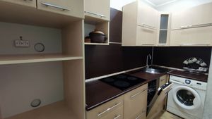 Кухня просторная, с выделенной зоной для готовки — настоящий подарок для ценителей домашней гастрономии. Здесь предусмотрено всё: функциональная рабочая область, добротная мебель, остающаяся в подарок новому владельцу, и место для уютных завтраков. Никаких бытовых неудобств — только вдохновение от процесса.