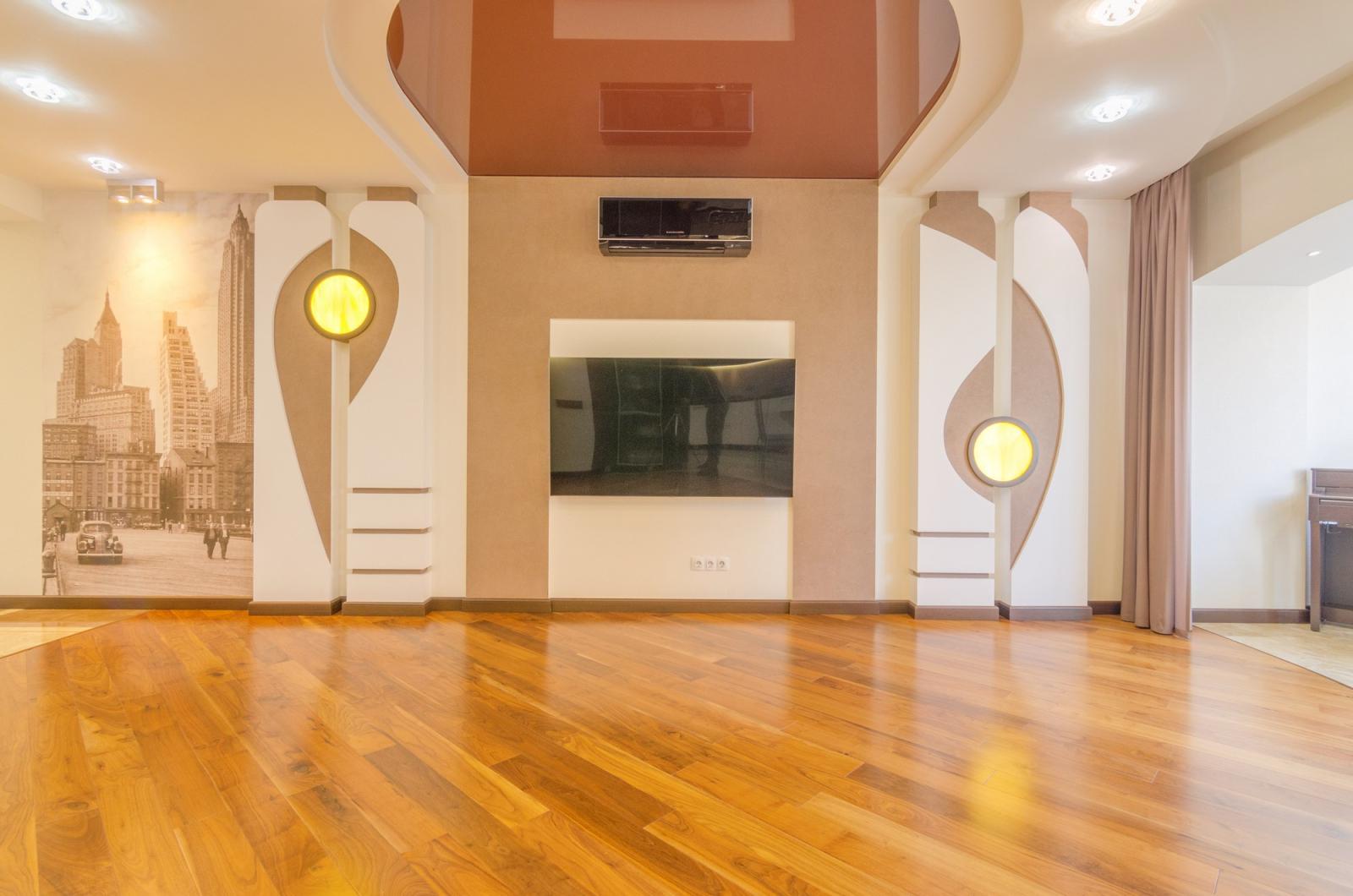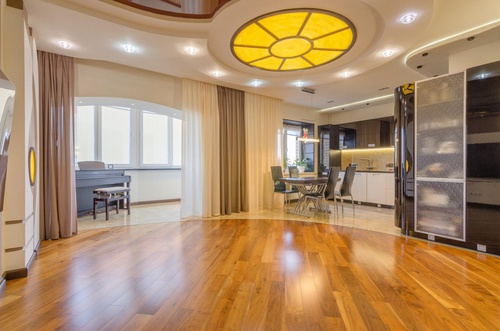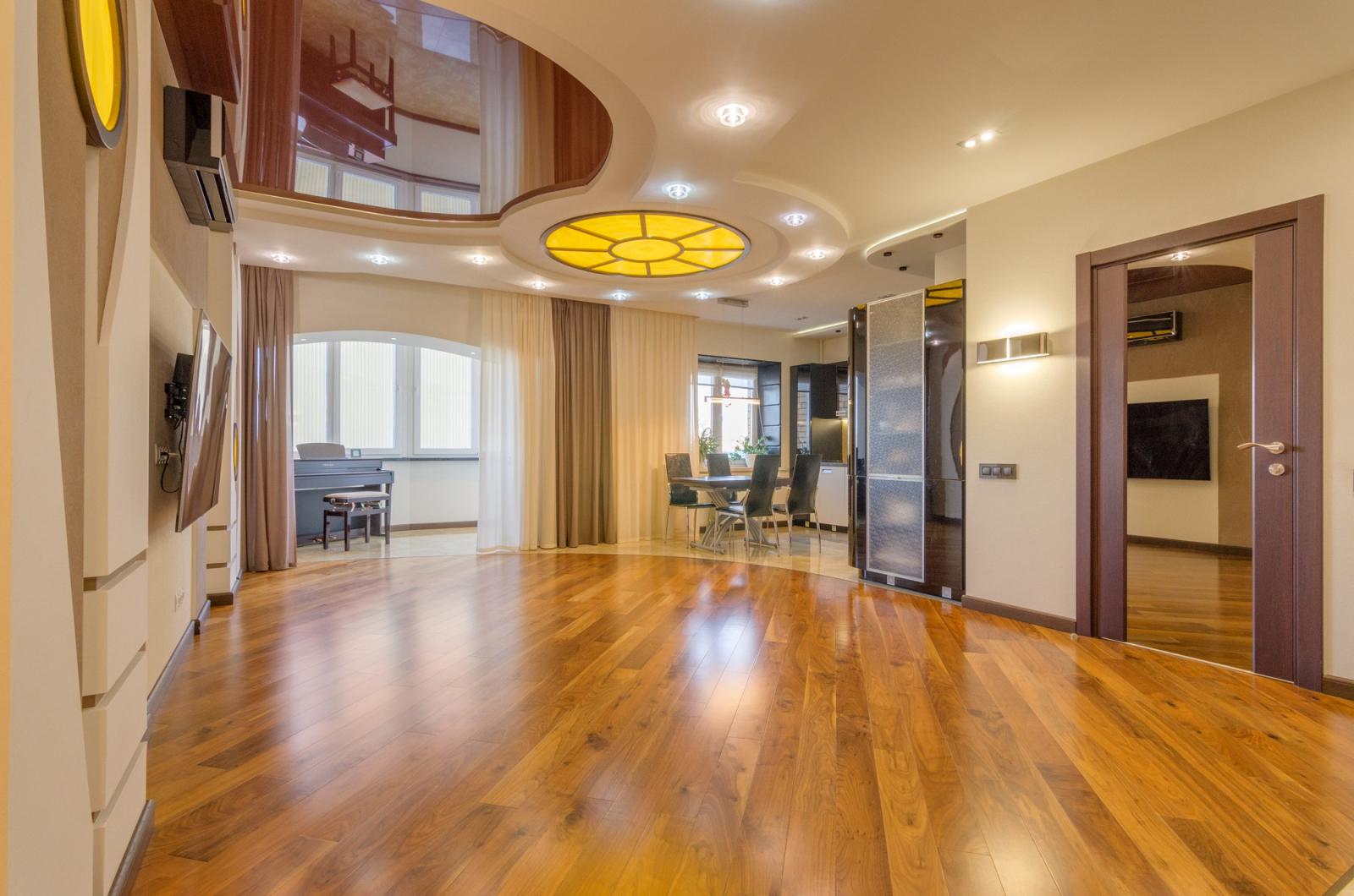 Полы смонтированы из разных материалов премиум классса - гостиная и детская массивная доска (Канада), американский орех и дуб терракота, зона кухни и коридора керамогранит (Испания) в спальне доска с покрытием вернего слоя фактурной натеральной кожей (кожаный пол Португалия, фабрика Granorte коллекция Corium.