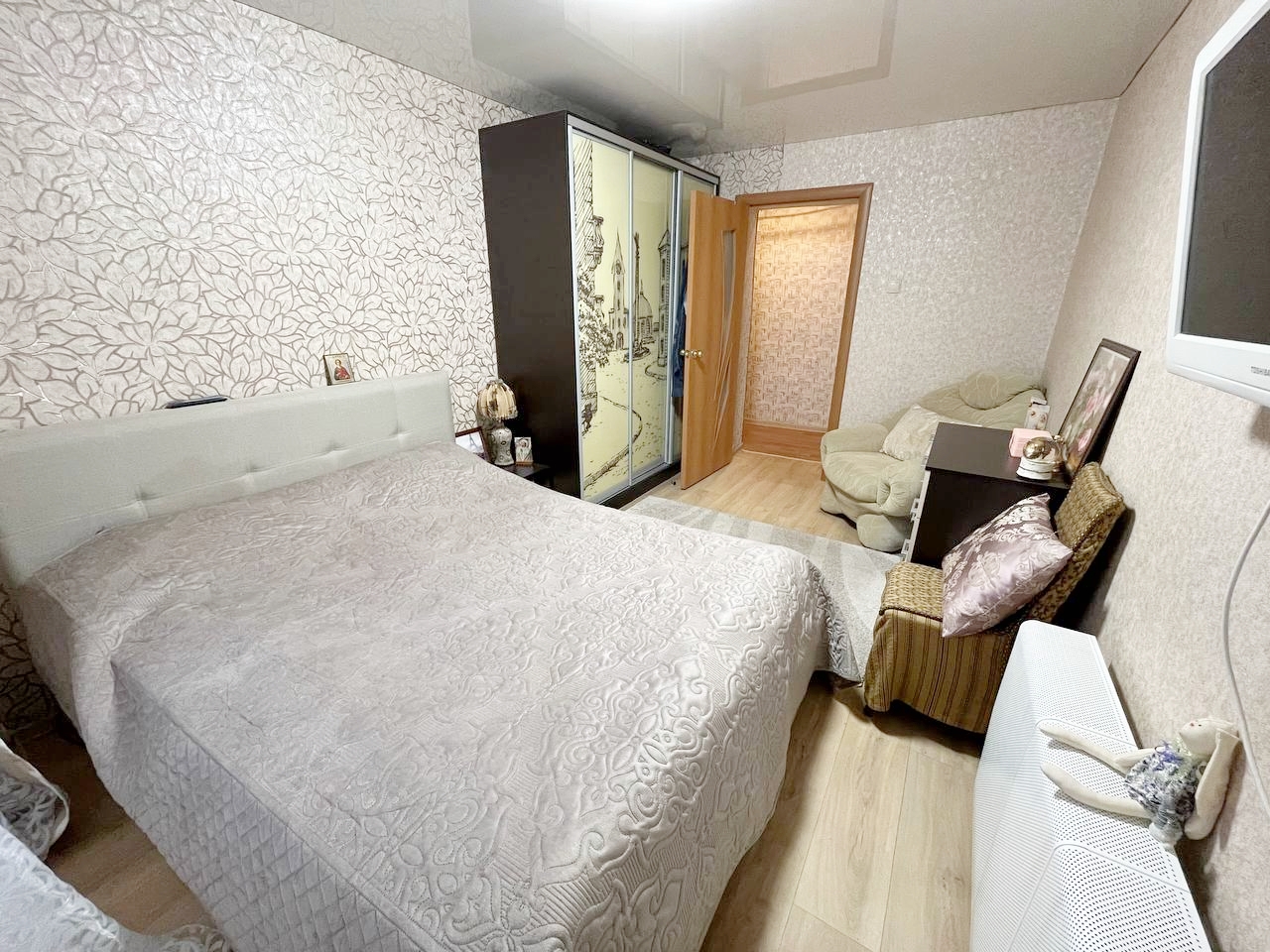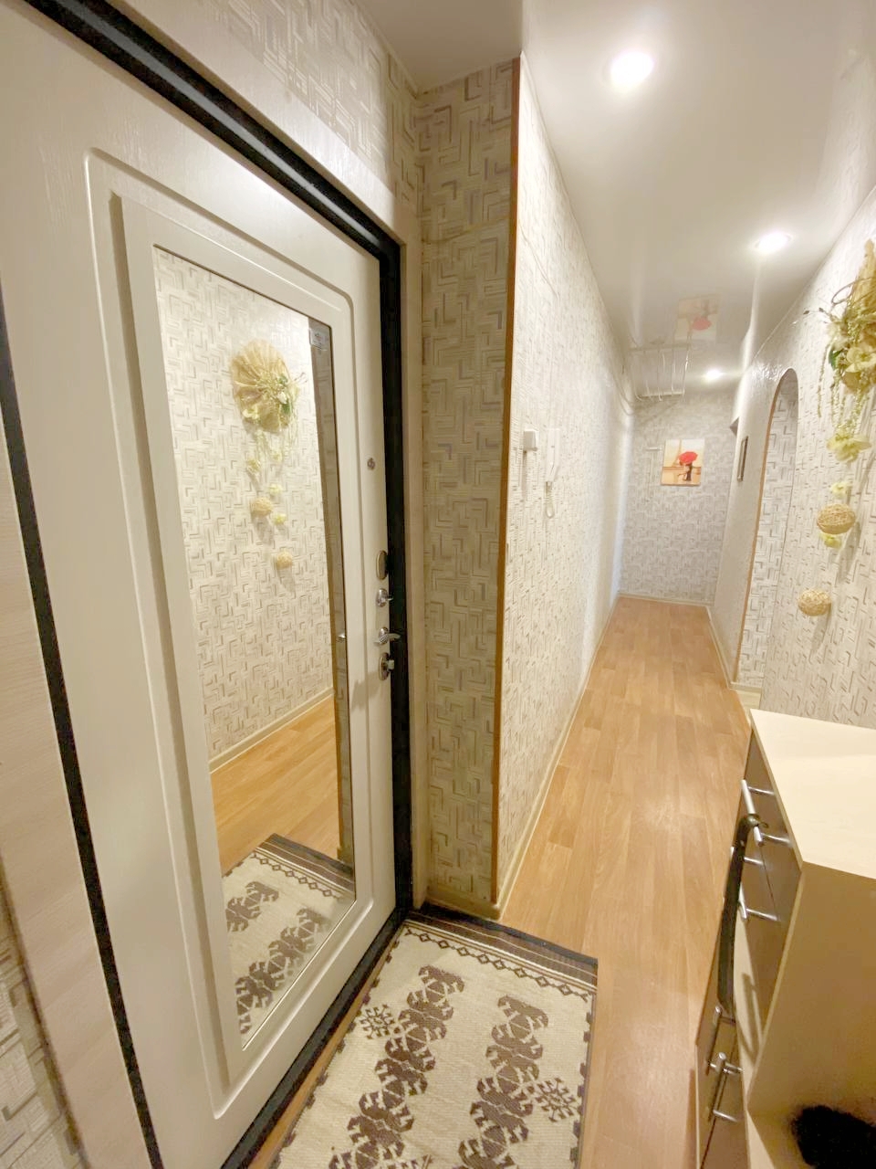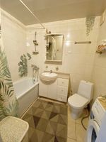 Новым собственникам остается: кухонный гарнитур, варочная панель,вытяжка, тумба и шкаф с зеркалом в ванной.