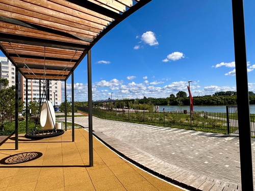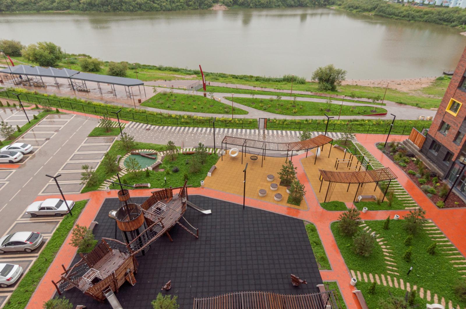 Атмосфера двора: дом расположен на "Затоновском берегу" с благоустроенной набережной, что дает возможность уютного отдыха рядом с домом. Территория дома огорожена забором, закрытая от доступа посторонних. Двор без машин. Во дворе, полностью свободных от автомобилей, дети могут свободно передвигаться по территории. Предусмотрены игровые комплексы для детей разных возрастов. Отдельная