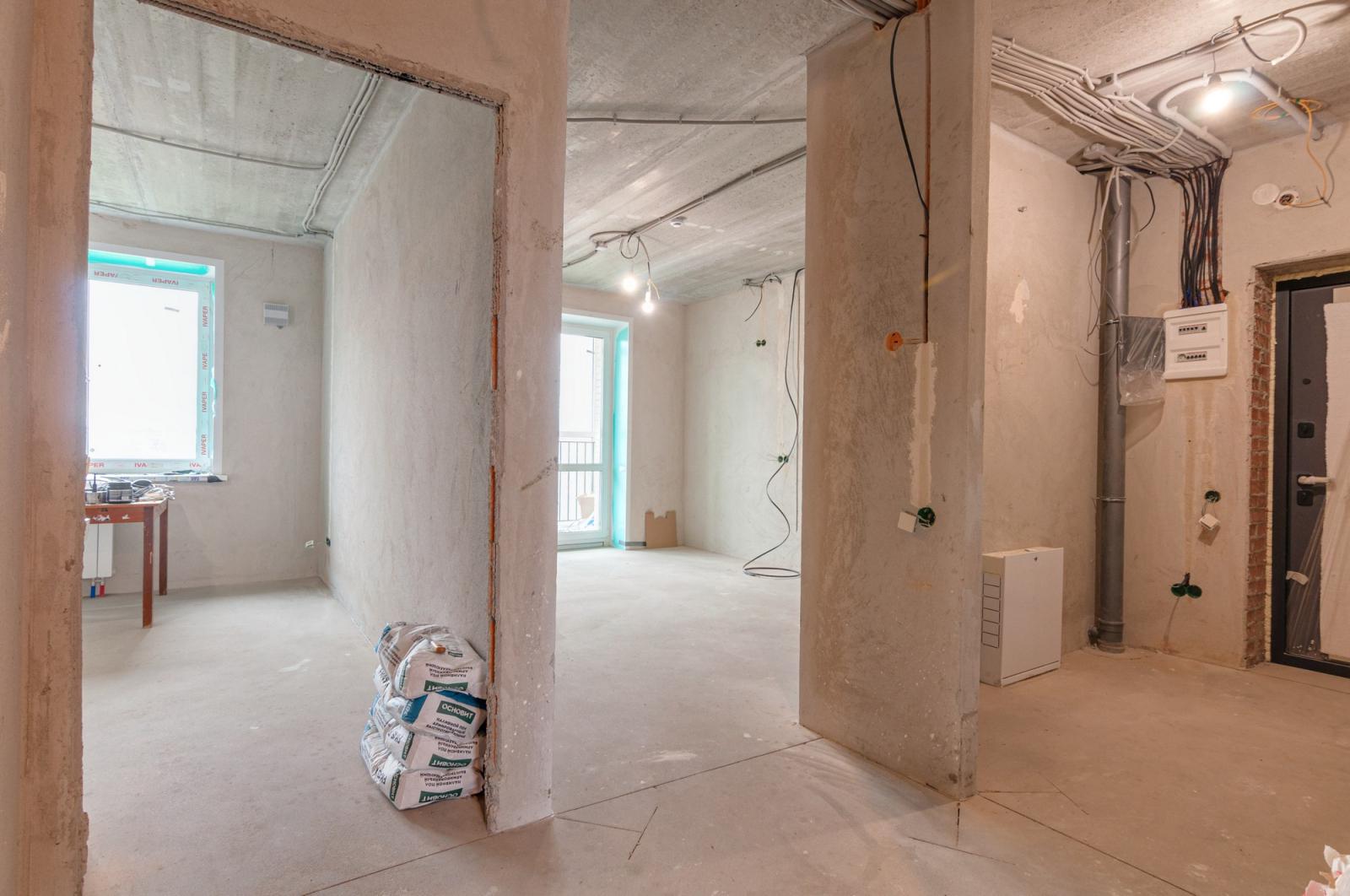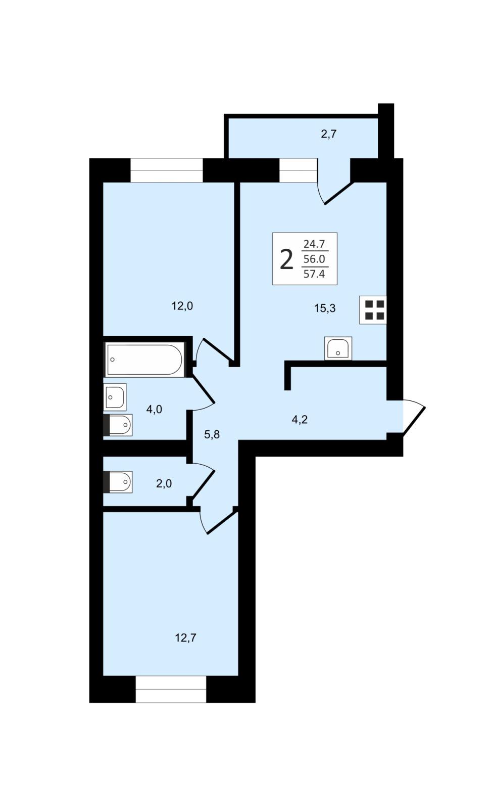Планировка квартиры: просторная кухня-гостиная с выходом на лоджию с панорамным остеклением, ниша в прихожей для встроенного шкафа, раздельный санузел.