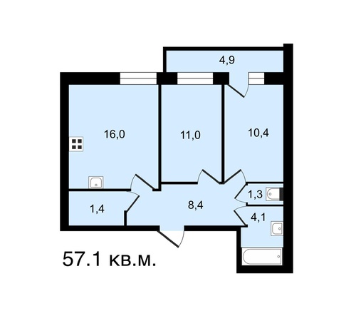 2-комнатная квартира 57.1м², 1/4 этаж