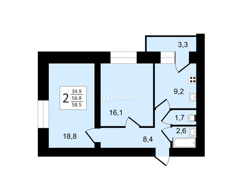 -2 изолированные комнаты правильной прямоугольной формы, где удобно расставить мебель