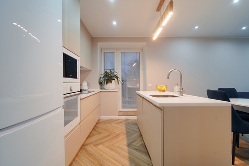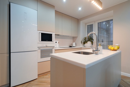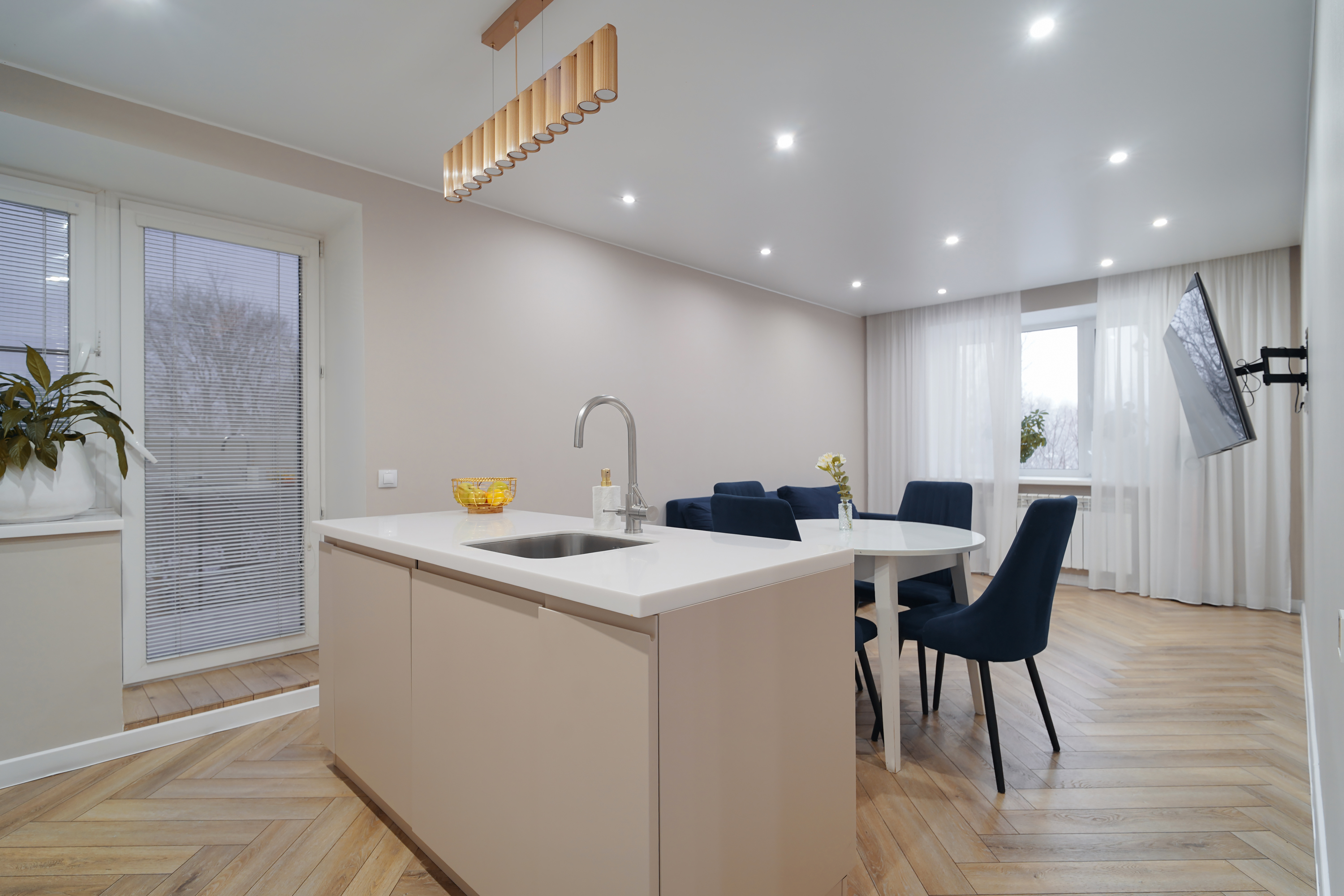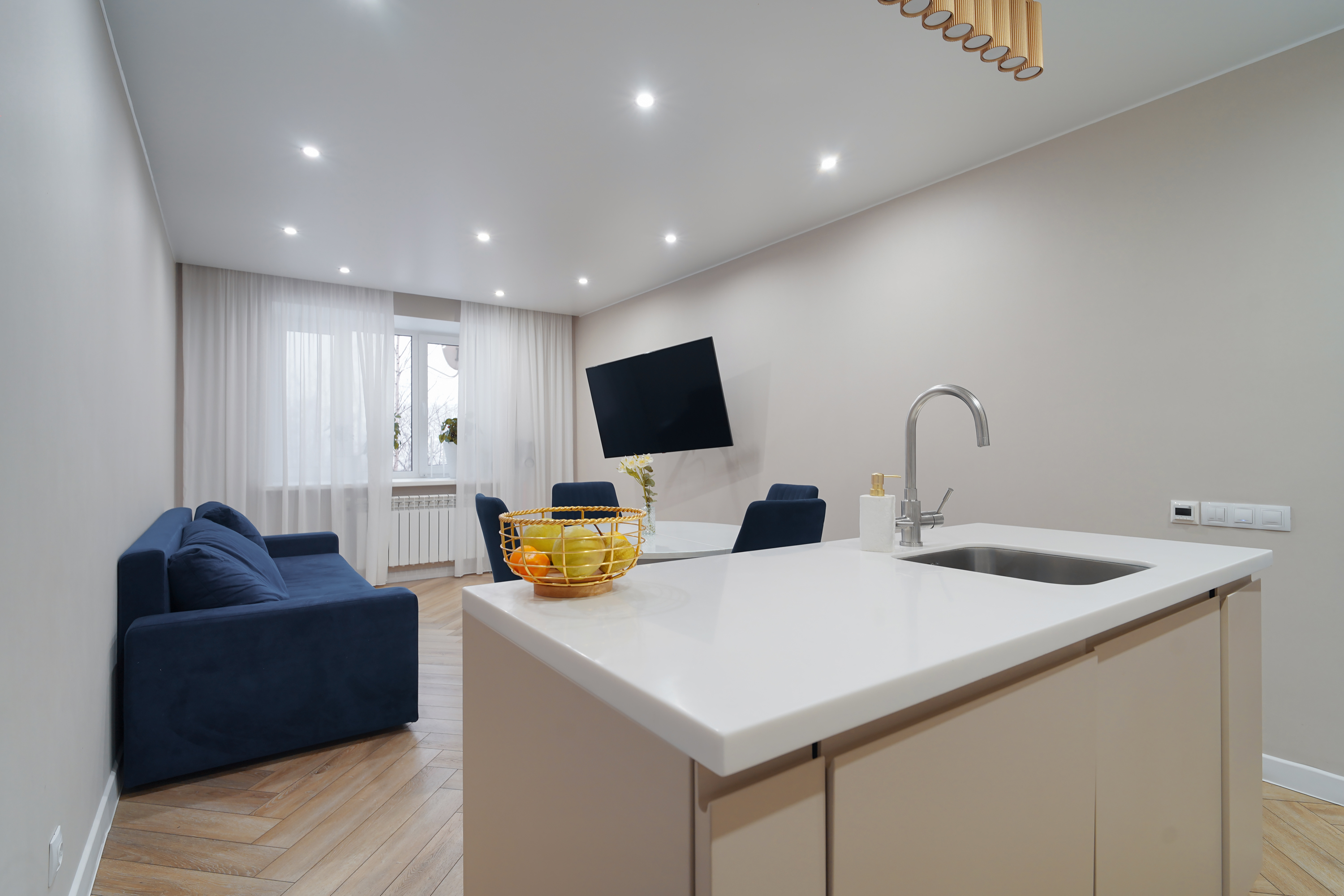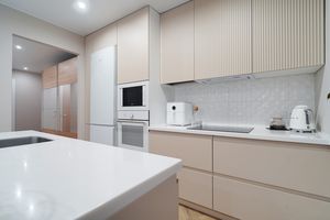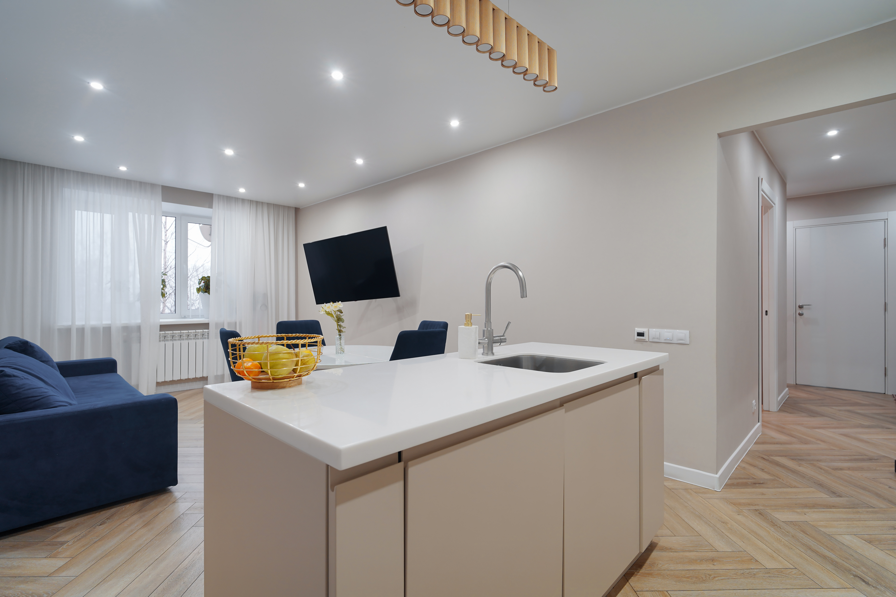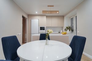 Сердце квартиры — шикарная кухня с островом, в который встроена стильная раковина. Это идеальное место для приготовления любимых блюд, дружеских посиделок и семейных завтраков. Вся качественная техника остается новому владельцу.