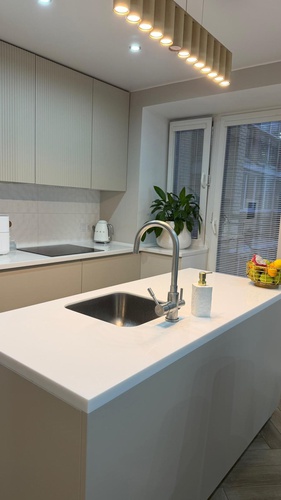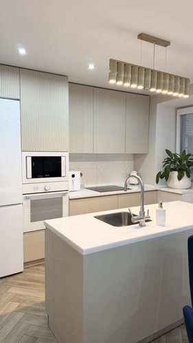 Сердце квартиры — шикарная кухня с островом, в который встроена стильная раковина. Это идеальное место для приготовления любимых блюд, дружеских посиделок и семейных завтраков. Вся качественная техника остается новому владельцу.