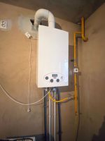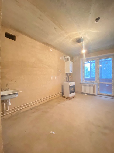 Установлен двухконтурный газовый котёл, горизонтальная (лучевая) разводка труб отопления и водоснабжения.