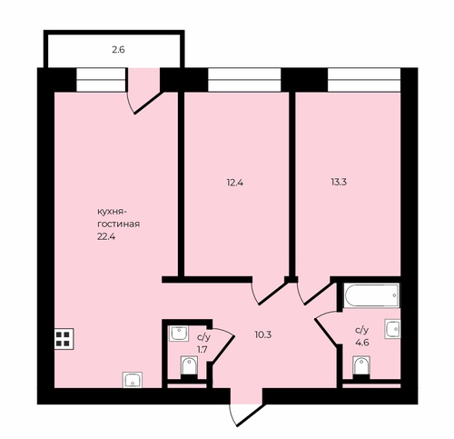 - просторная кухня - гостиная 22,4 кв.м объединяет две зоны в одном пространстве - помещение для проведения досуга и приема пищи;