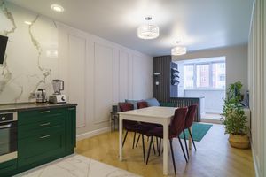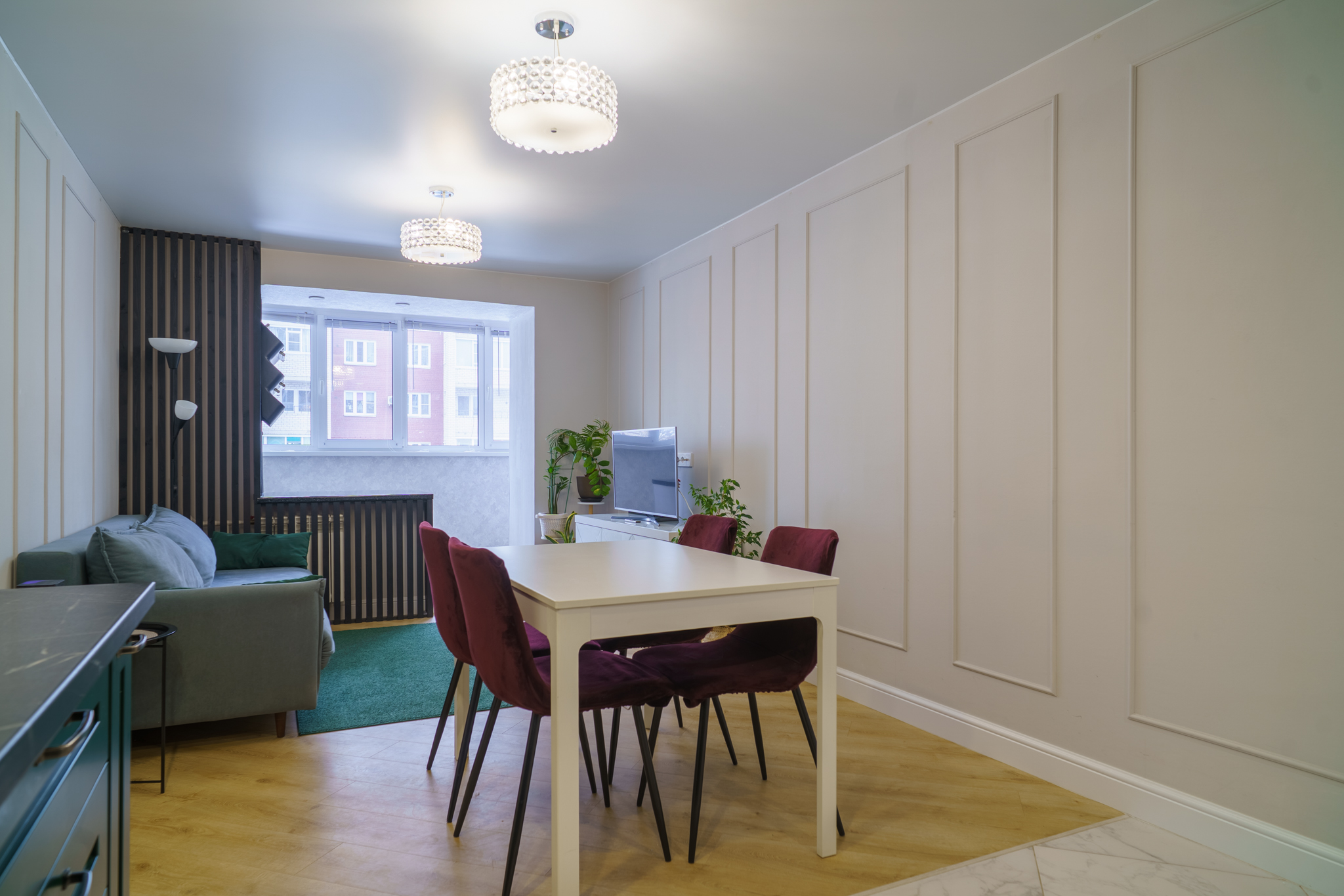 Просторная кухня-гостиная и две изолированные комнаты, которые выходят на разные стороны.