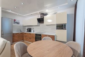 Каждая хозяйка по достоинству оценит просторную кухню – гостиную, в которой приятно готовить и собираться вечером всей семьей или принимать гостей!