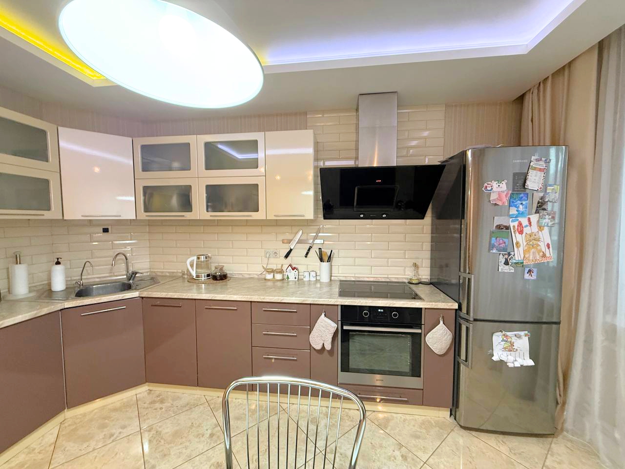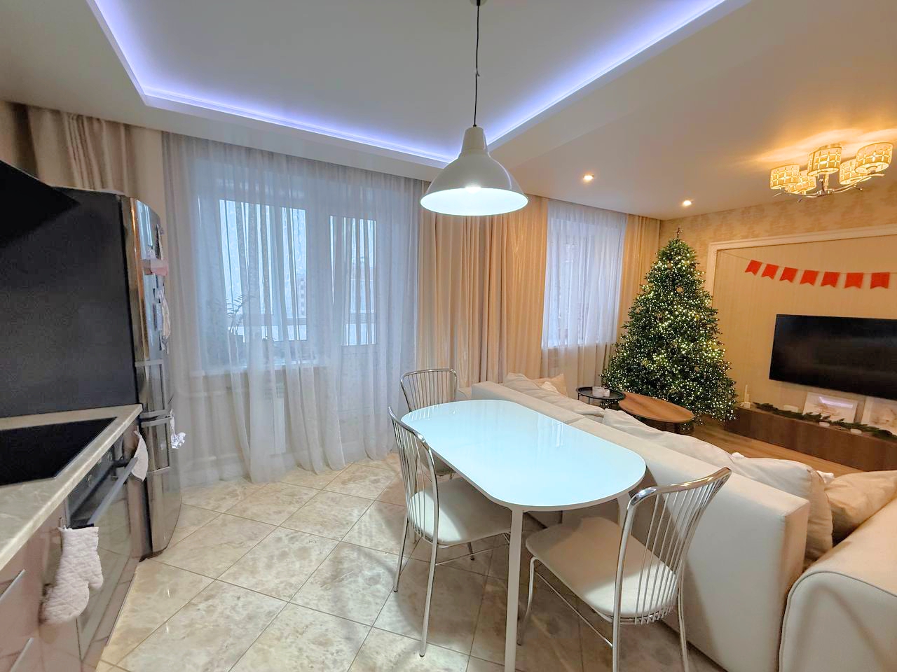 Просторная кухня-гостинная разделена на функциональные зоны.