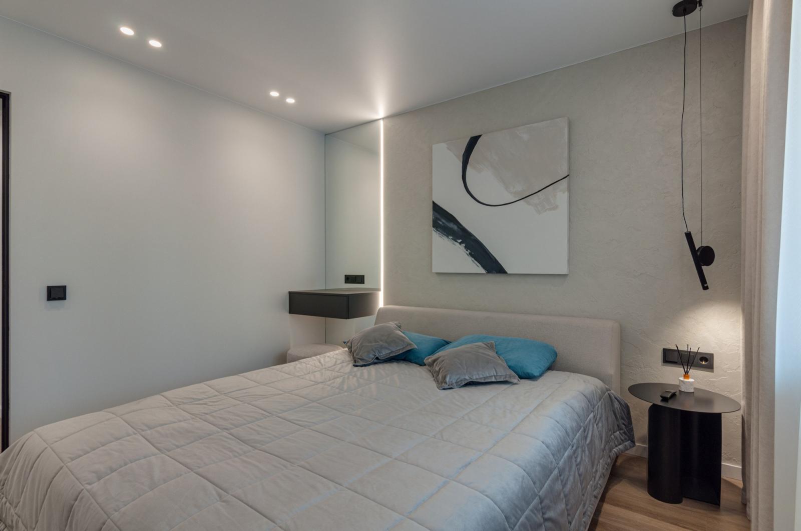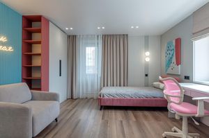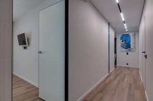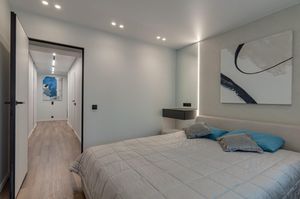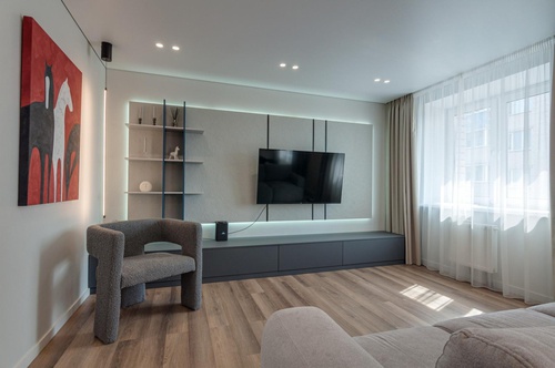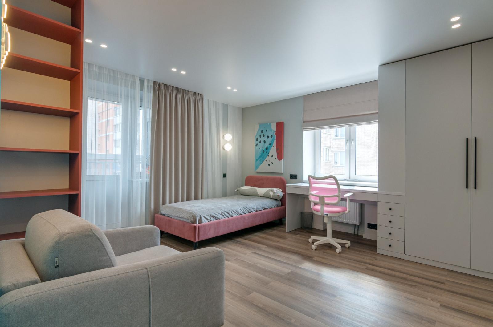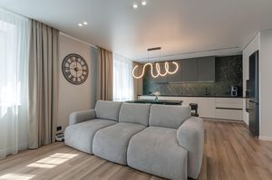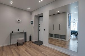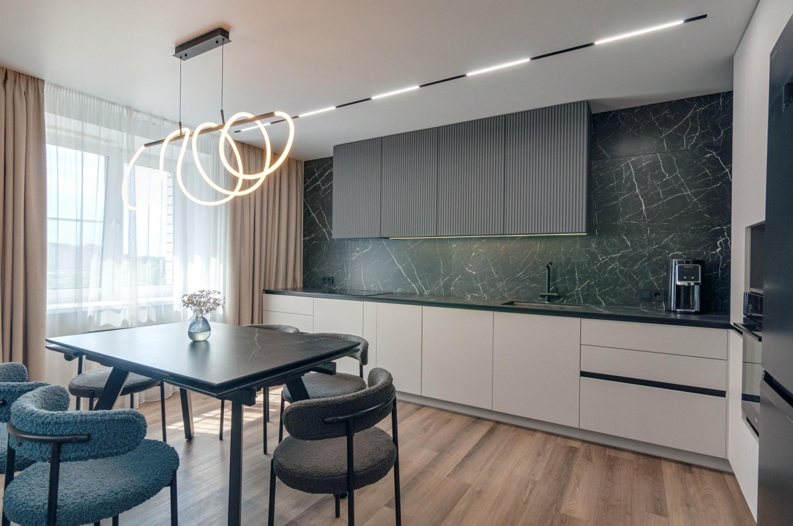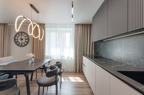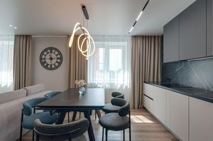 Квартира расположена на седьмом этаже современного кирпичного дома 2021 года постройки. Общая площадь — 84,3 кв. м, включая жилую площадь 34 кв. м и просторную кухню площадью 35 кв. м. Высота потолков 2,75 м создаёт ощущение дополнительного пространства.