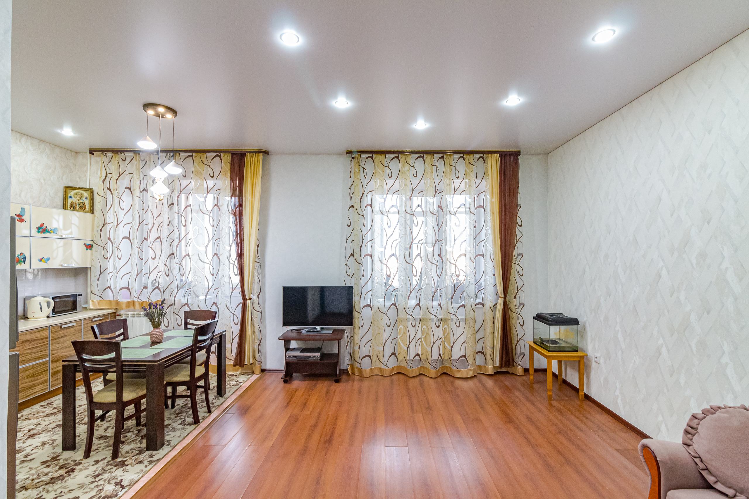 - просторная кухня-гостиная с выходом на застекленную лоджию, сочетает место для приготовления пищи, приема гостей и отдыха;