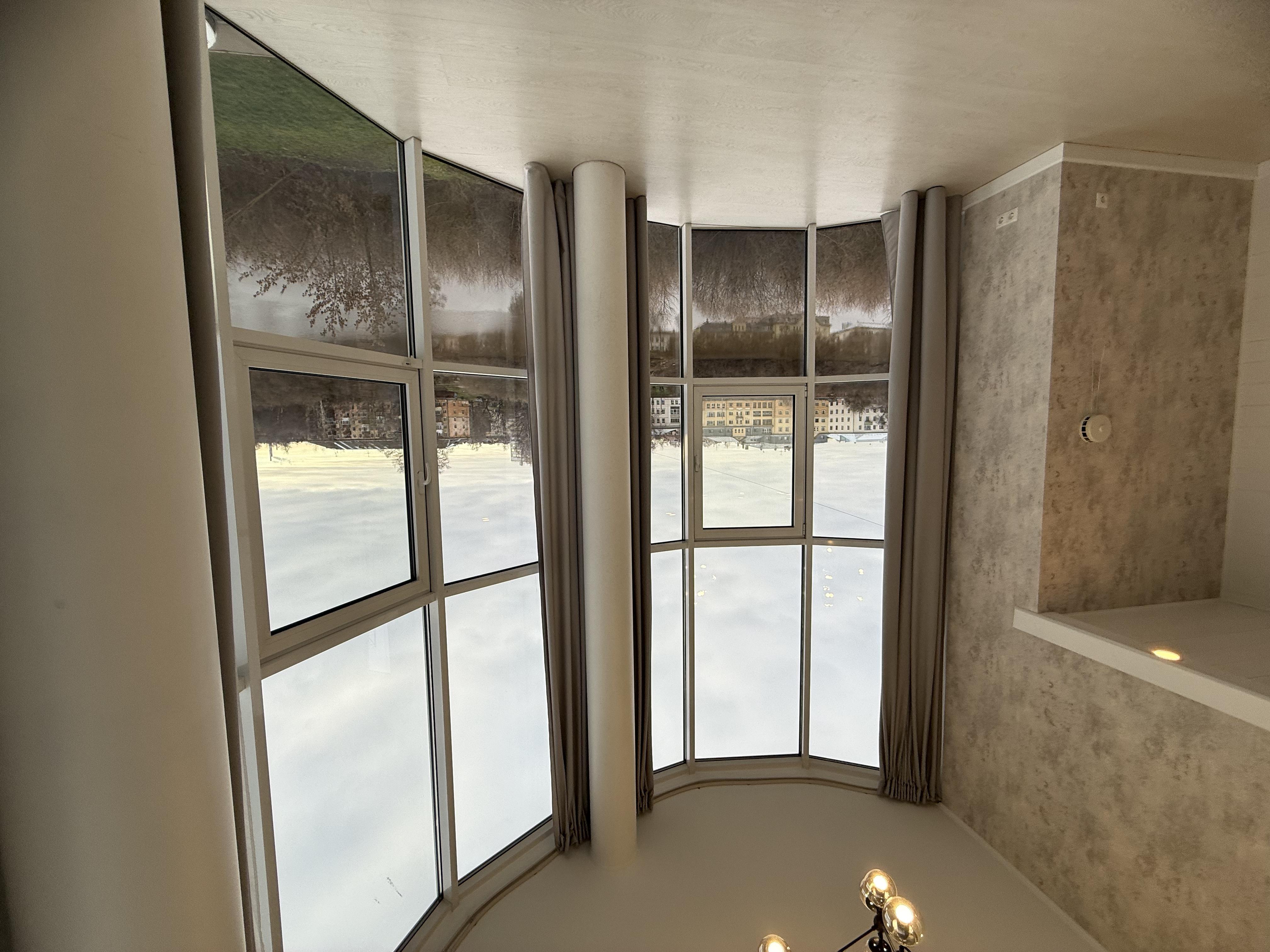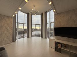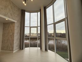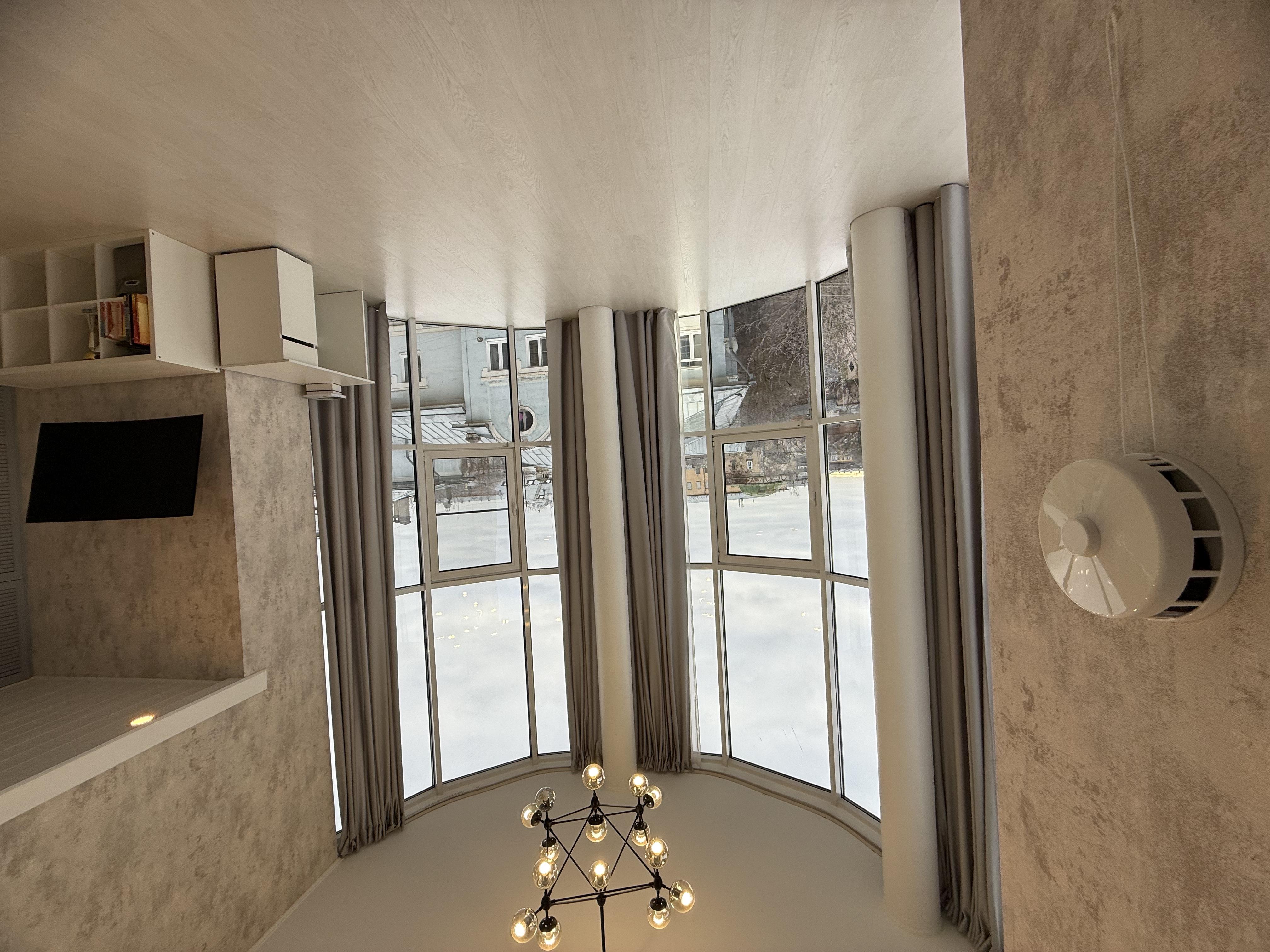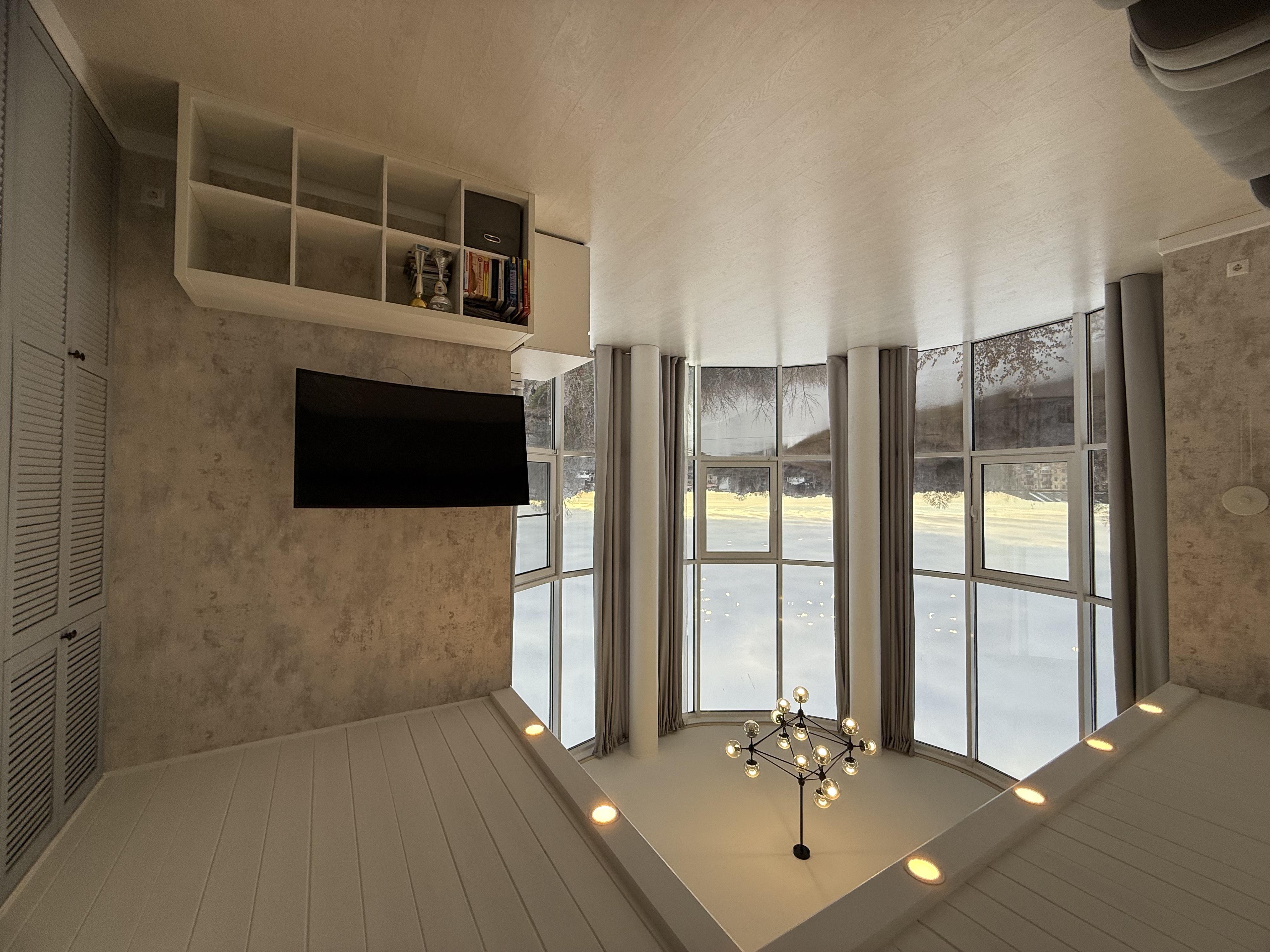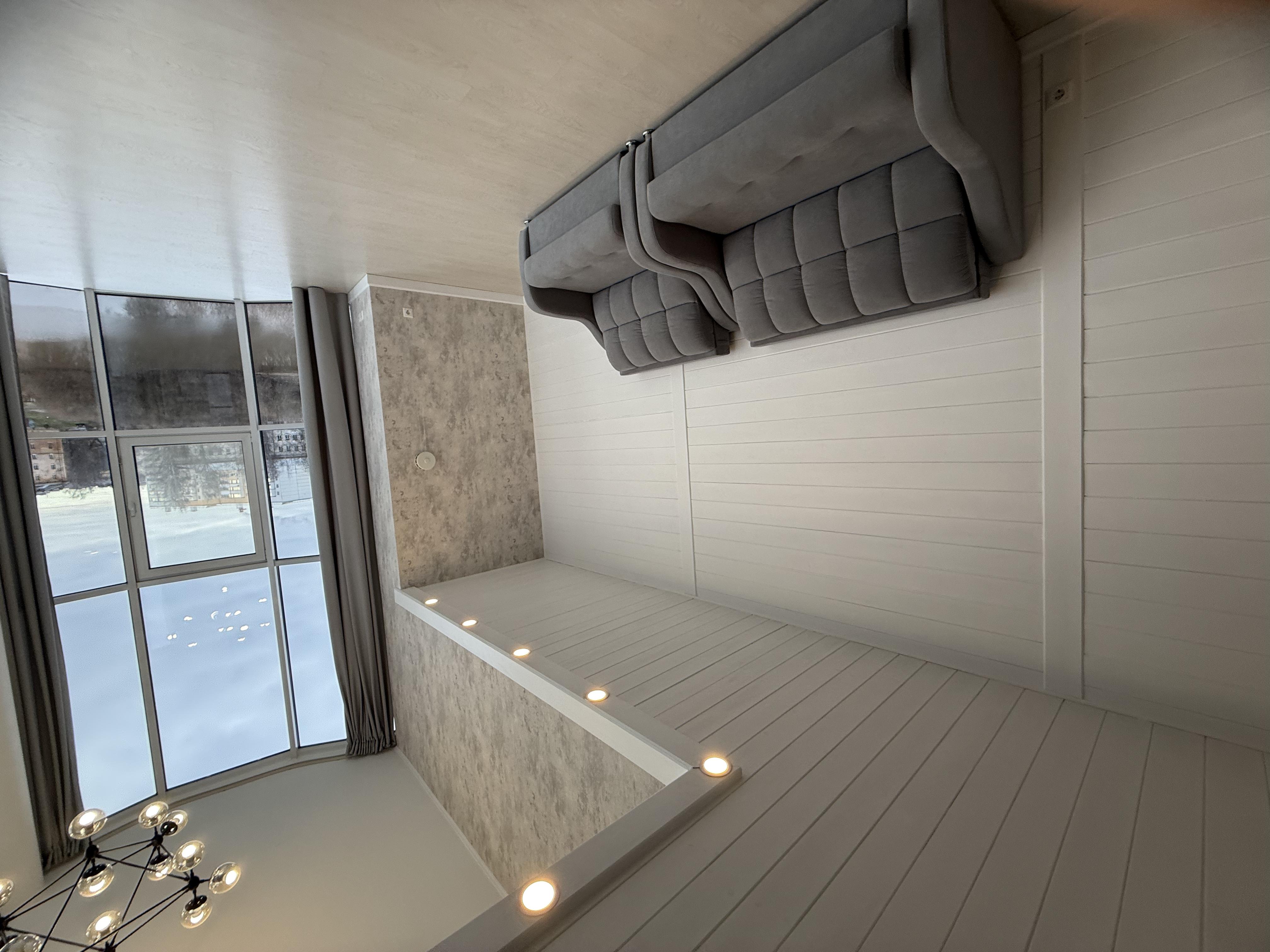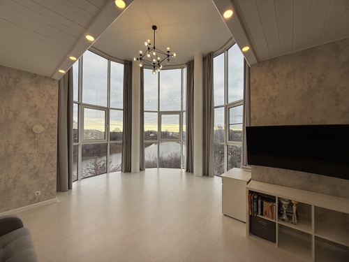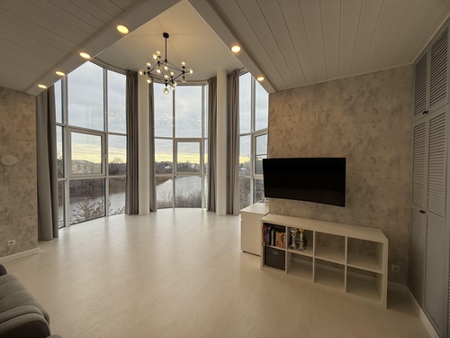 В большой комнате высокие потолки 4,5 м витражное остекление - живописным видом на реку Вологда.