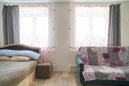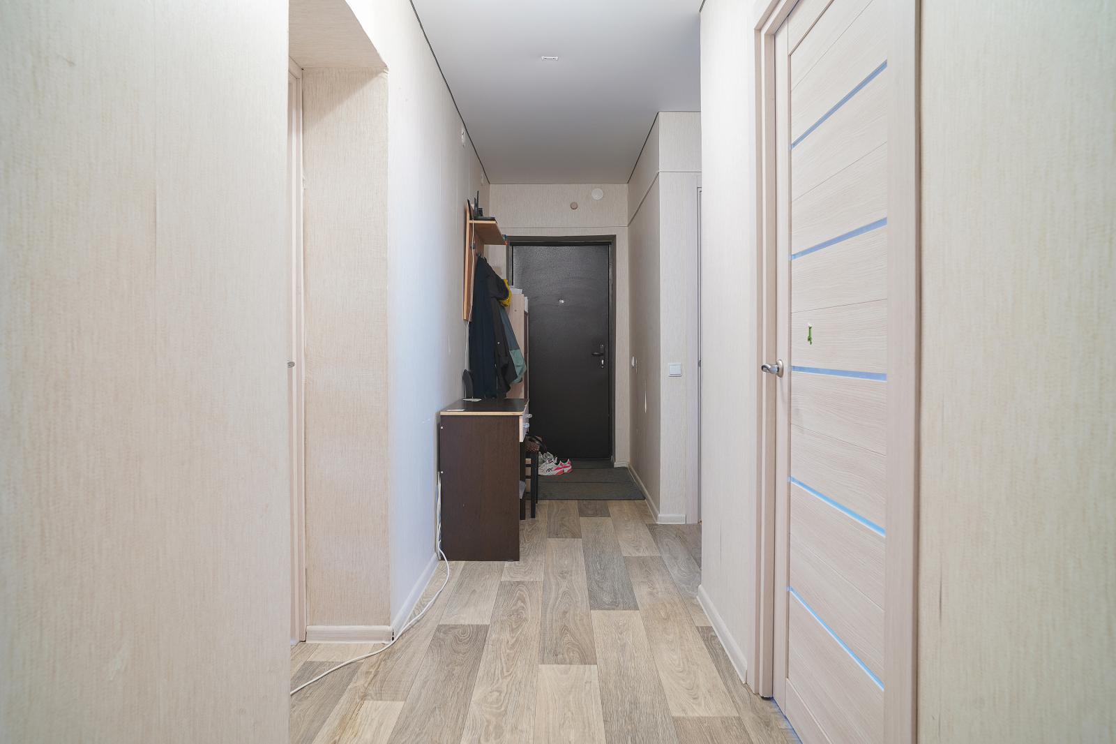 Квартира не углового расположения, комнаты просторные и светлые, с видом на улицу. Жилая площадь составляет 34,7 кв. м, кухня — 8,1 кв. м. Площадь комнат: 8,4 + 8,9 + 17,4 кв. м.