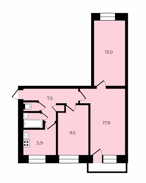 Общая площадь составляет 58,5 кв. м, из которых 40,4 кв. м — жилая площадь. Комнаты имеют удобную планировку: 17,9 кв. м, 13,0 кв. м и 9,5 кв. м. Есть застекленный балкон.