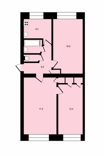 ПЛОЩАДИ, КОТОРЫЕ КОМФОРТНЫ: общая площадь квартиры - 62,2 кв.м., что обеспечивает достаточно места для семьи. Кухня - 6,2 кв.м., три просторные комнаты - 17,4 кв.м., 16,5 кв.м. и 12,4 кв.м. - уютные пространства, подходящие для создания удобства для себя и близких.