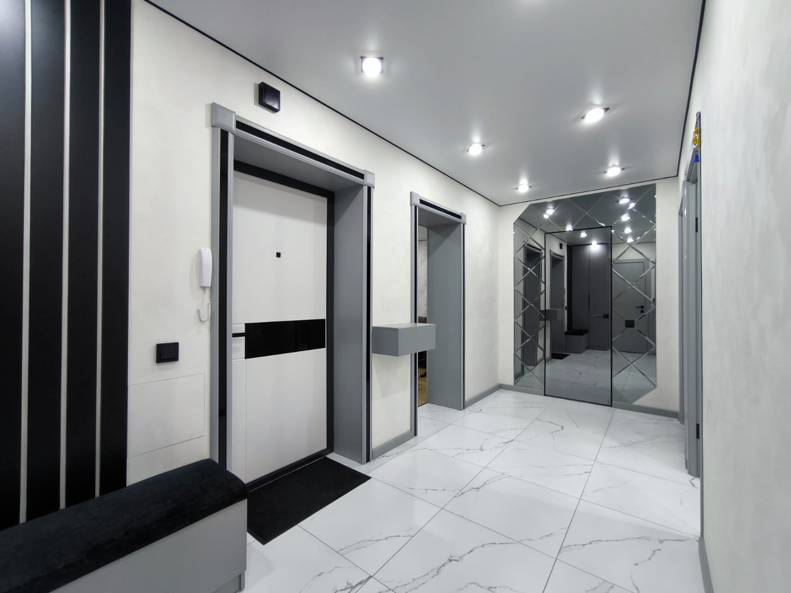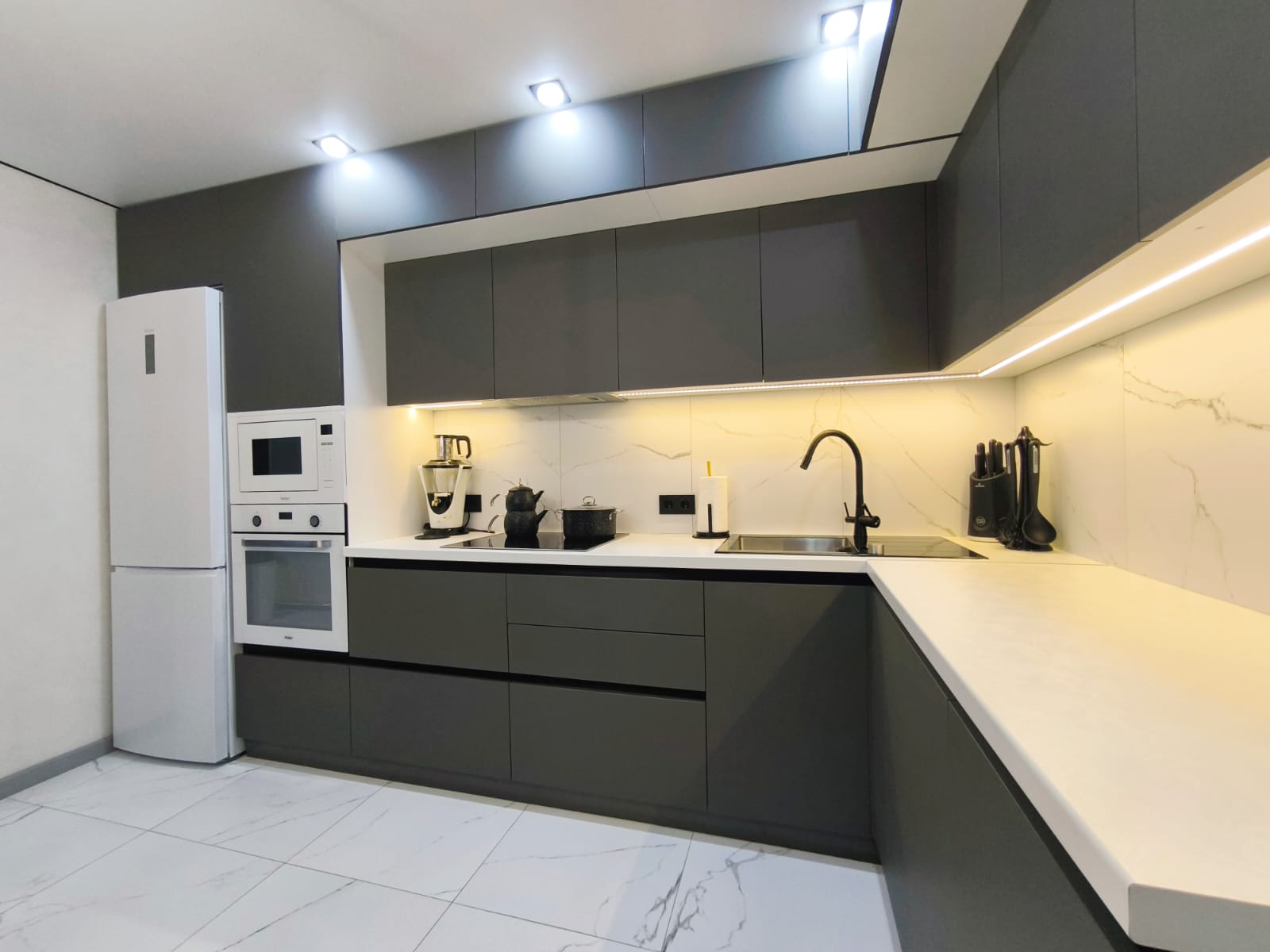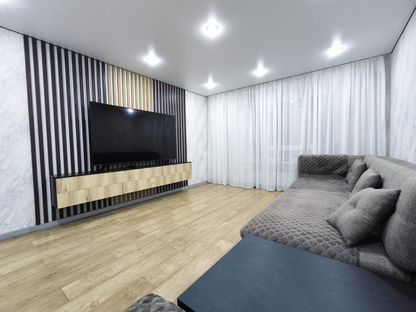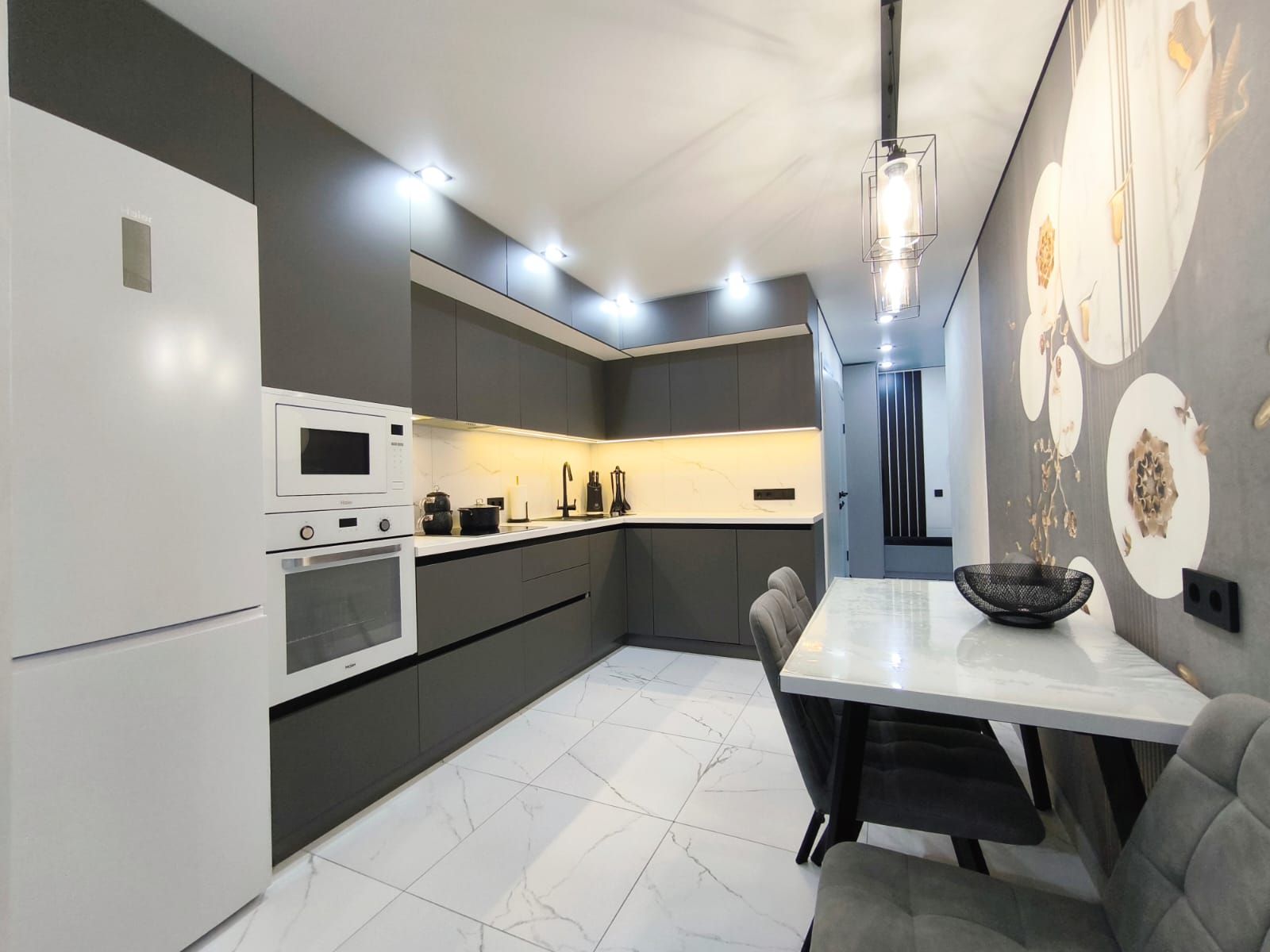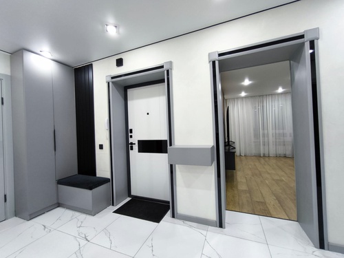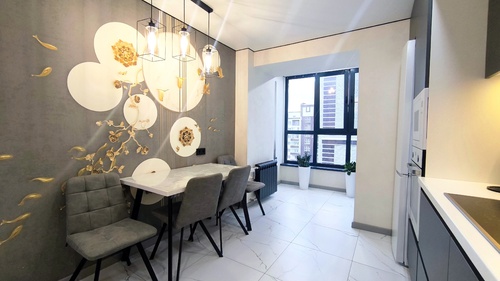 - Во всей квартире смонтирован натяжной потолок со встроенными светильниками. На кухне и в спальной комнате предусмотрено несколько сценариев освещения.