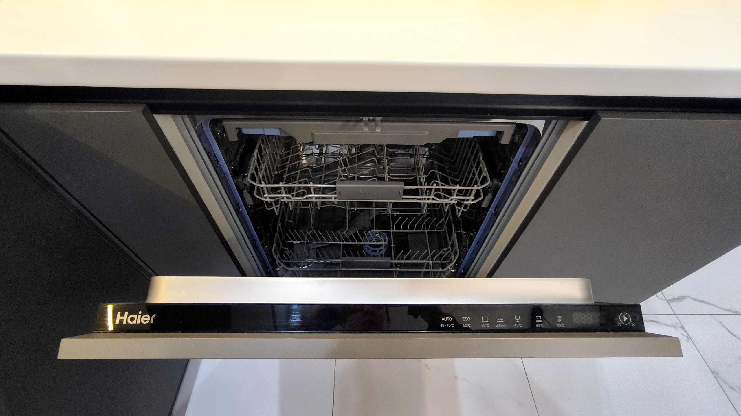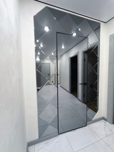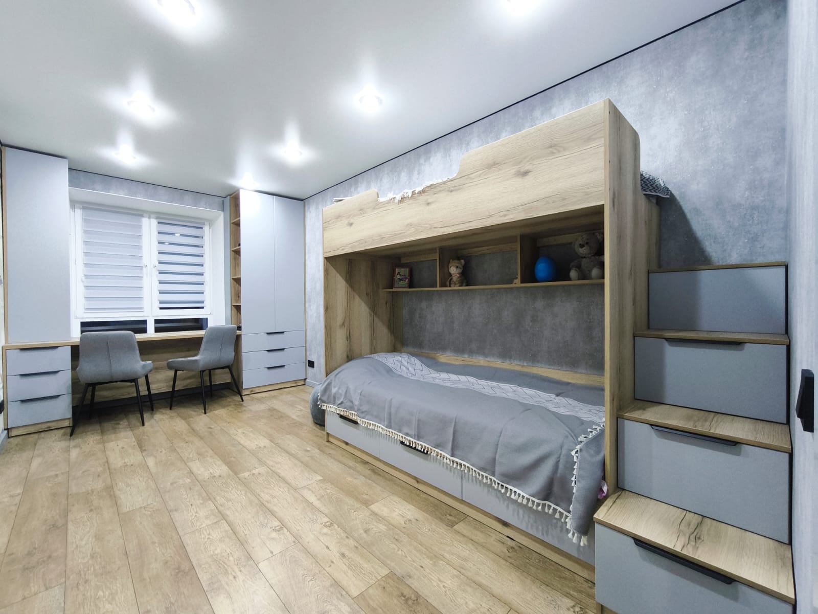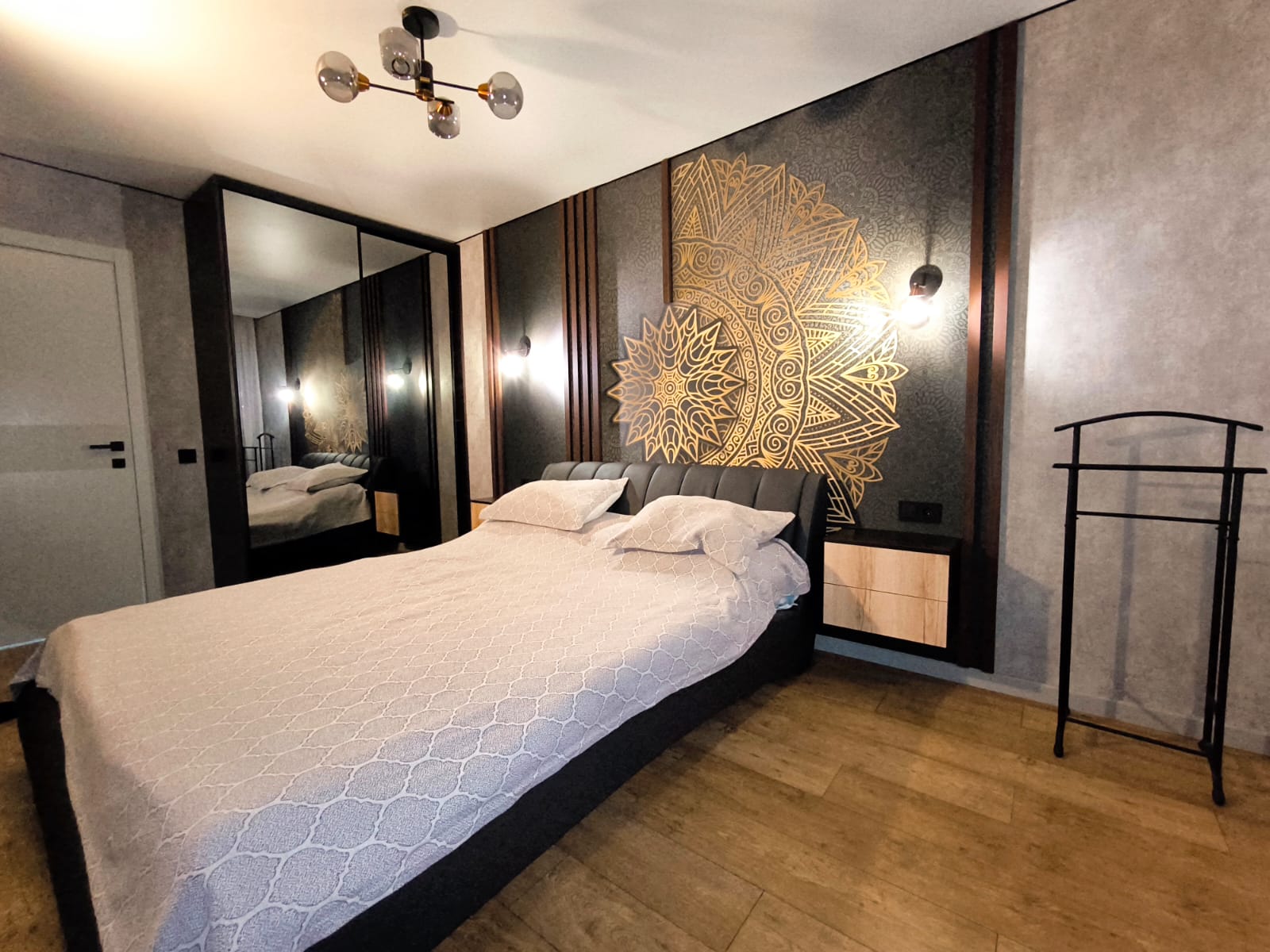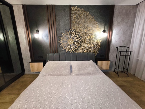 - Во всей квартире смонтирован натяжной потолок со встроенными светильниками. На кухне и в спальной комнате предусмотрено несколько сценариев освещения.