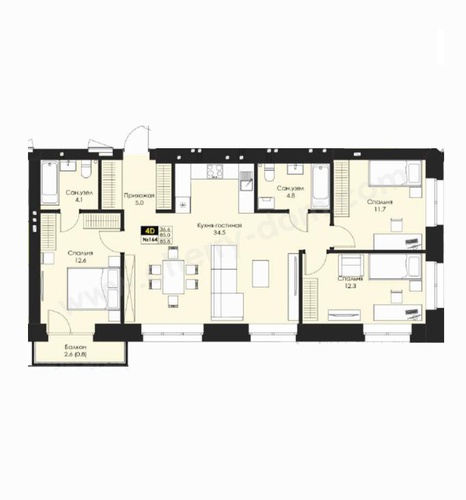 Достойная "правильная" планировка с разделением хозяйской мастер-спальни и детских с помощью кухни-гостинной