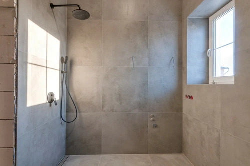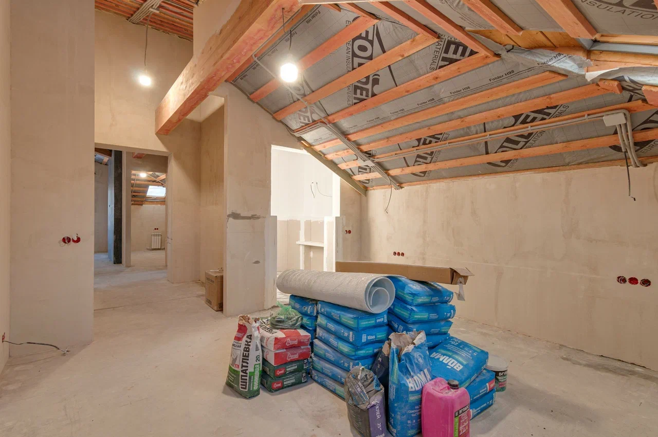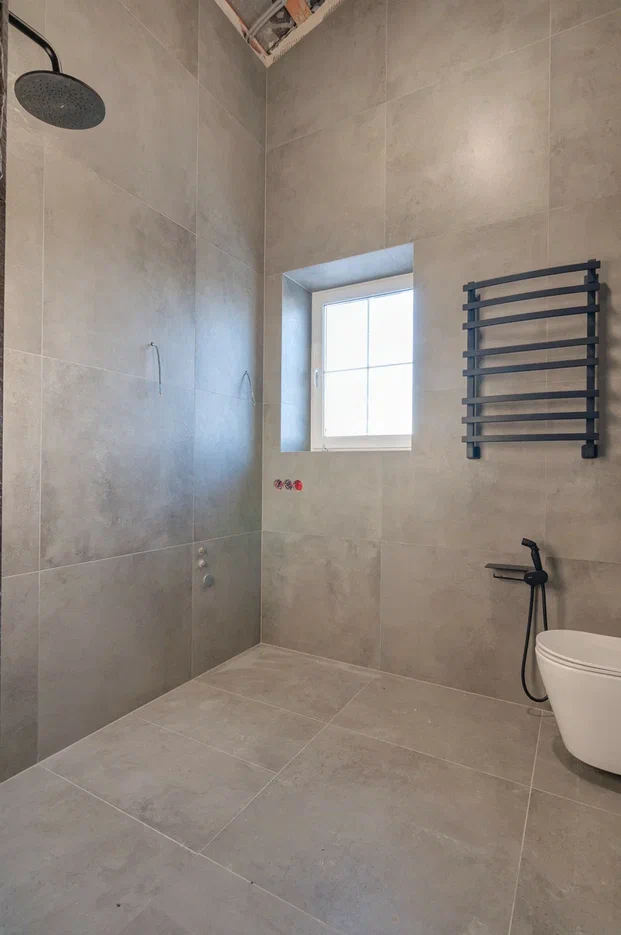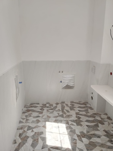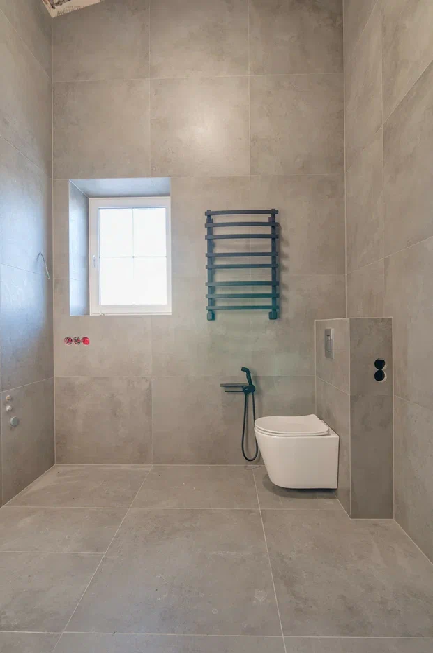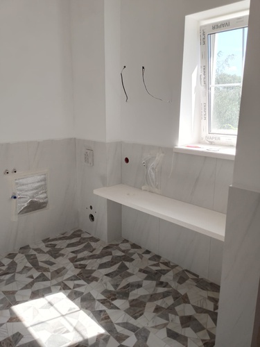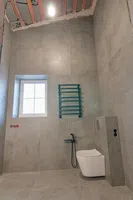 - В санузле в мастер- спальной часть стен и полы выложены керамогранитом, часть стен подготовлены к покраске, смонтирована инсталляция. Необходимо только установить сантехнику. Смеситель, санфаянс, полотенцесушитель и иная необходимая сантехника закуплена.