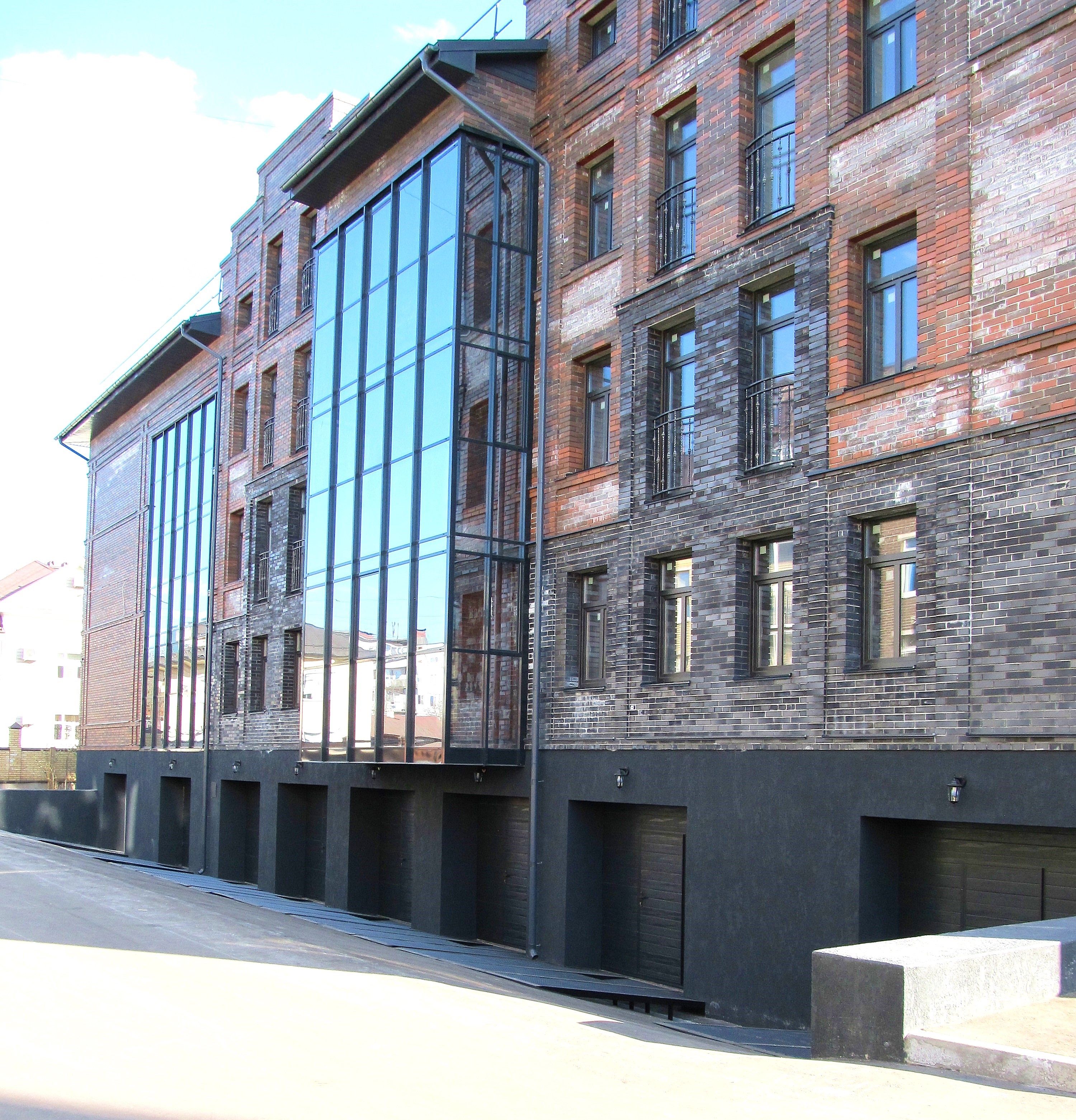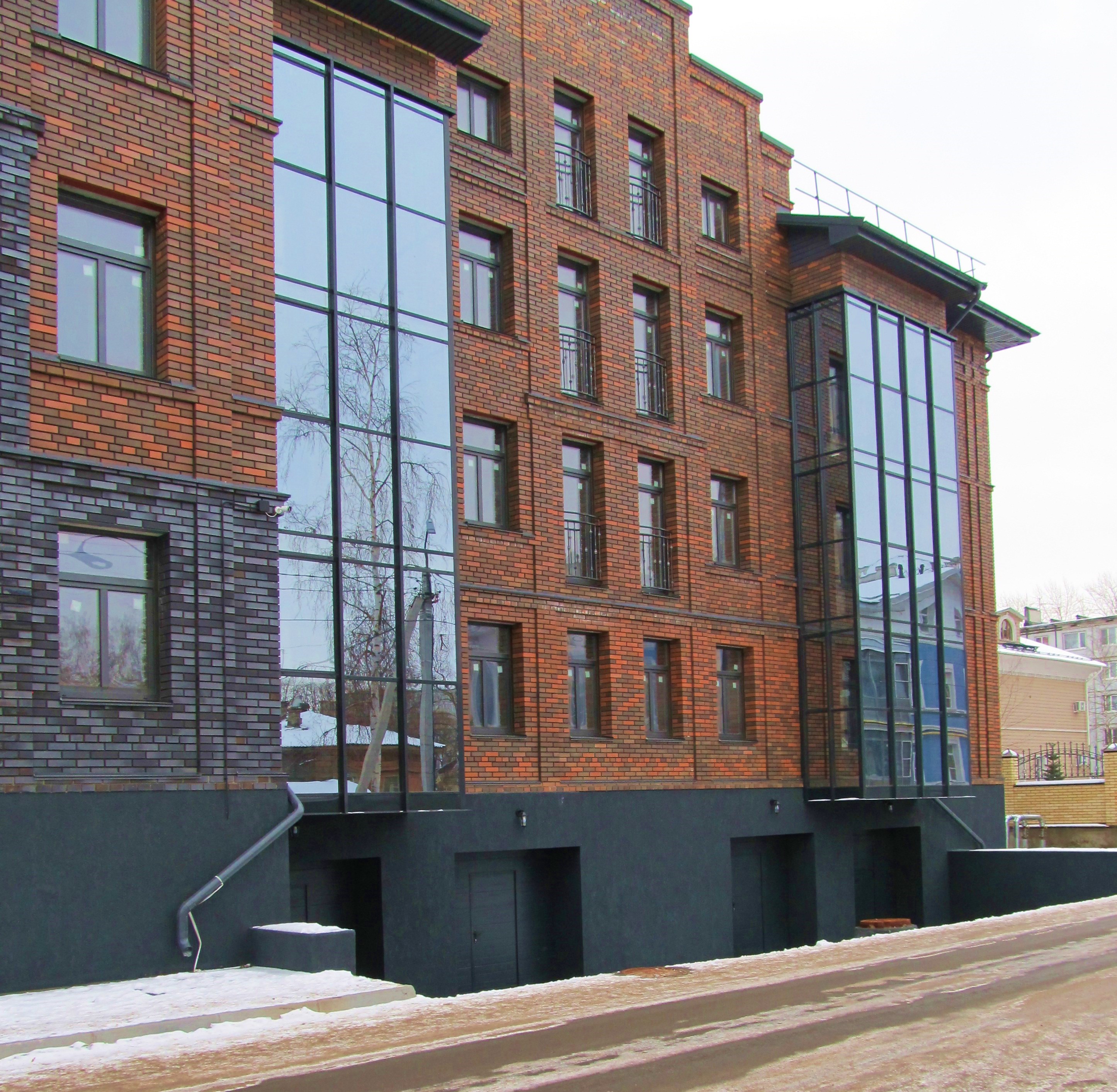 Дом кирпичный (керамический кирпич фирмы Recke), всего 43 квартиры, придомовая территория, видеонаблюдение. Толщина внешних несущих стен 65 см (кладка в 2,5 кирпича).